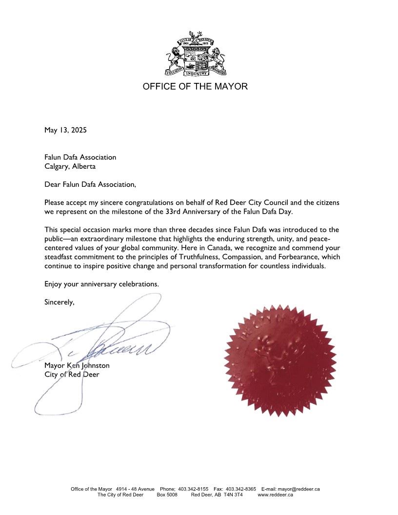亚省第三大城市──红鹿市市长约翰斯顿(Ken Johnston)写道:“法轮大法弘传三十周年这一非凡的里程碑,彰显了全球法轮大法社群的坚韧、团结,以及和平的价值观。在加拿大,我们认可并赞扬你们对真、善、忍原则的坚守,这些原则持续激励着无数人提升自己,变成更好的人。”