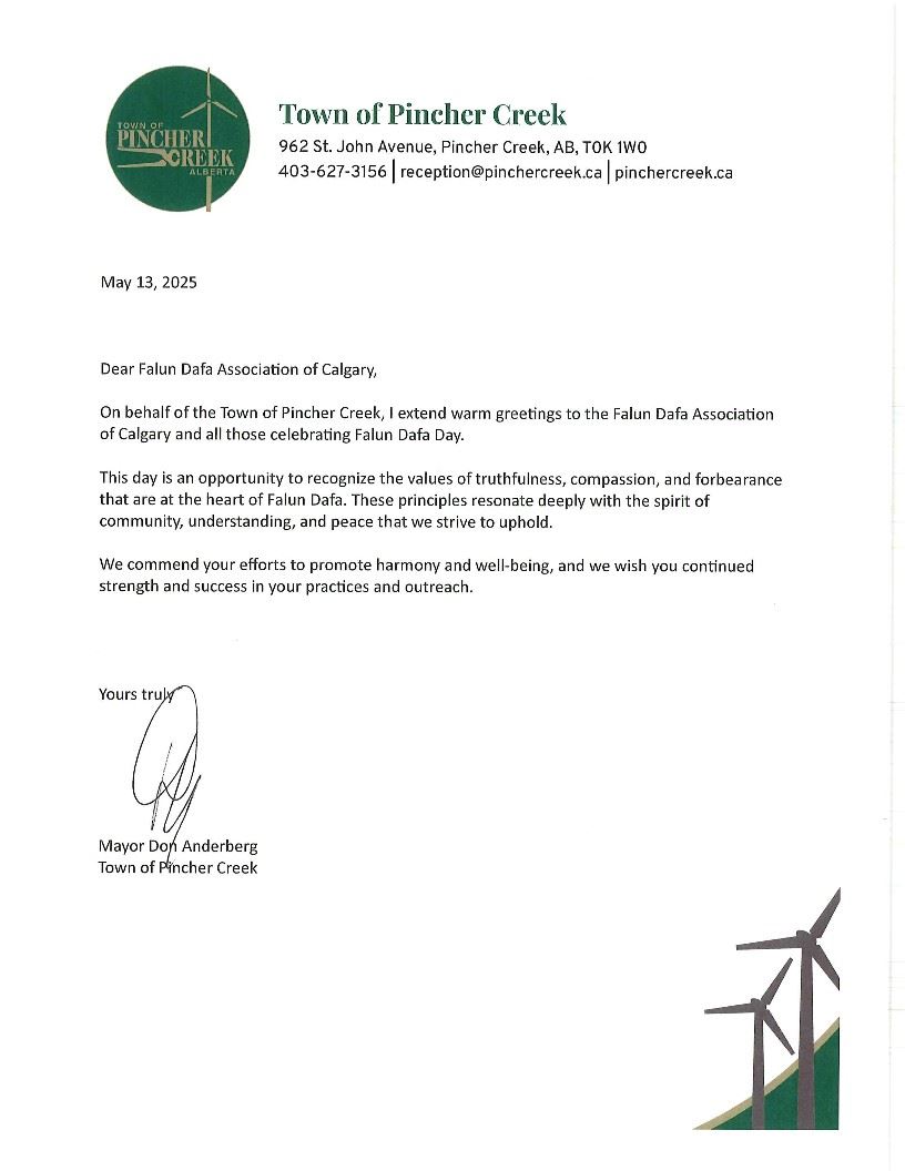 卡尔加里第九选区市议员卡拉(Gian-Carlo Carra)表示,“很高兴写信支持2025年5月举行的年度法轮大法日活动。这是庆祝法轮大法所代表的‘真、善、忍’价值观的重要日子。”他感谢法轮大法团体“通过身心健康促进安乐与谐和的努力”。