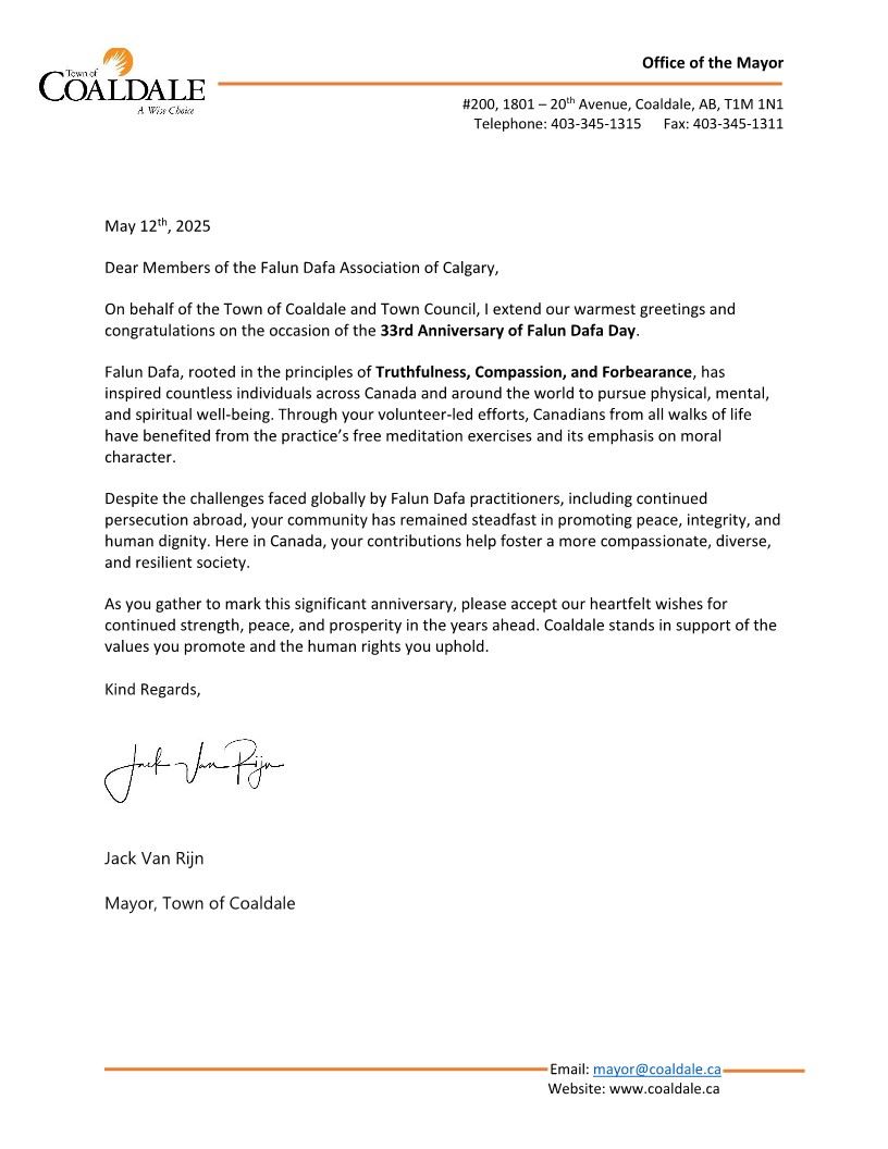 科尔代尔镇镇长范瑞恩(Jack Van Rijn)在贺信中高度赞扬法轮大法,“法轮大法以真、善、忍为原则,激励了加拿大乃至全世界无数的民众追求身、心、灵的健康。法轮功免费教功,强调道德品性,通过志愿者的努力,各行各业的加拿大人都从中受益。”