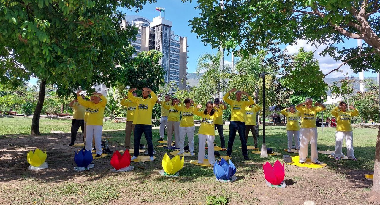 ![]() 图1:二零二五年五月十日,法轮功学员在通哈市中心的玻利瓦尔广场举行集体炼功。 |