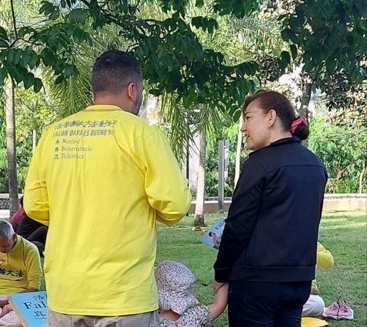 桑德拉·帕特里夏·甘巴(Sandra Patricia Gamba)是一位护士,修炼大法十三年了。谈到得法的契机,桑德拉回忆道,那是一个周日,她和丈夫在公园里收到法轮功学员递来的传单,于是二人有缘知道了法轮功和真、善、忍。在接下来的周日,他们又来到公园学习了功法动作,此后一直修炼至今。