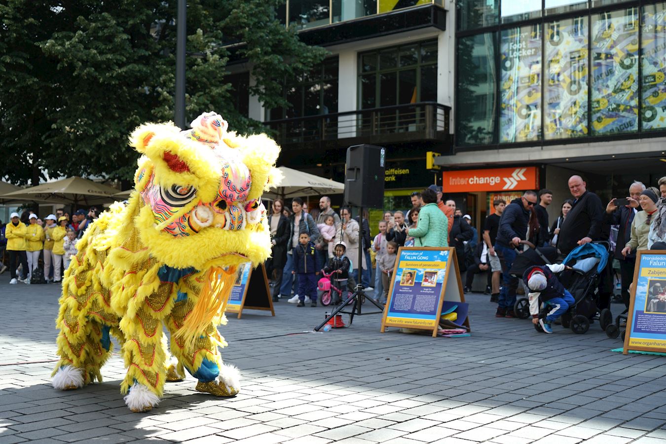 一百多位法轮功学员,包括一些来自其它国家的学员,给过往民众发放法轮功的真相资料,展示五套功法,表演了舞狮、仙女舞和腰鼓等节目。他们还恭敬地向大法创始人李洪志先生致以生日问候,并录制了祝贺视频。