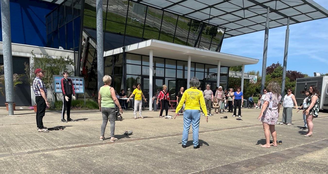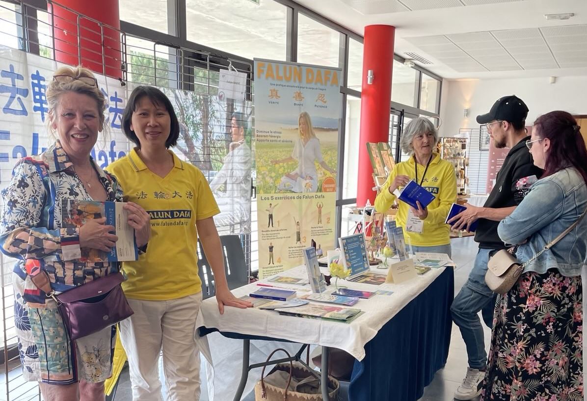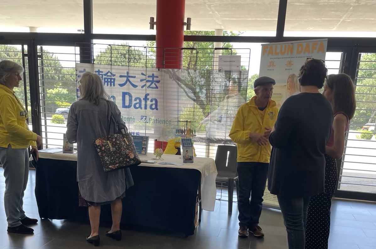 两个下午,在展会外露天广场,法轮功学员进行了教功活动。周末阳光明媚。学功的人都很珍惜这段时光,他们都索取了法轮功学员的联络方式,以便在距离圣布雷万二十分钟的圣纳泽尔(Saint Nazaire)炼功。