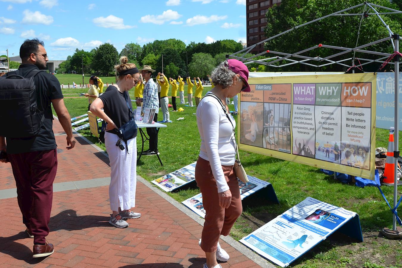 看到法轮功学员练功的壮观场景后,贺小姐驻足观看真相展板。“你们这么多人在这里搞活动,是为什么?”贺小姐一边观看展板一边问道。