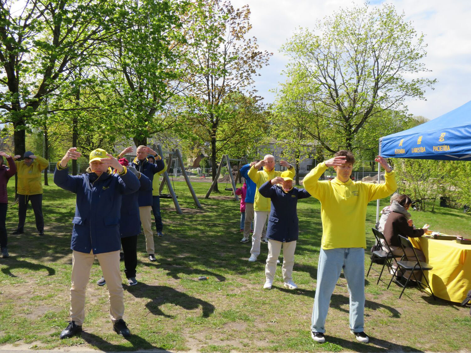 ![]() 图1:拉脱维亚学员在庆祝第二十六届世界法轮大法日的活动中展示五套功法,吸引不少游客关注。 |