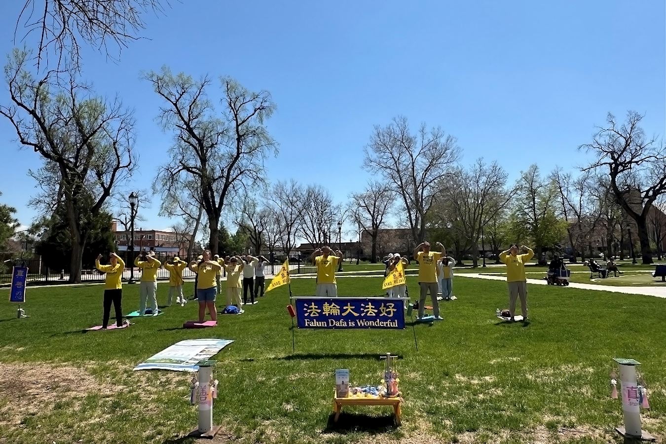 ![]() 图2:二零二五年五月十日,科罗拉多州法轮功学员在科泉市中心的阿卡西亚公园(Acacia Park)庆祝世界法轮大法日暨法轮大法公开传出三十三周年。活动中,学员们集体炼功、展示五套功法和传递法轮功的真相。 |