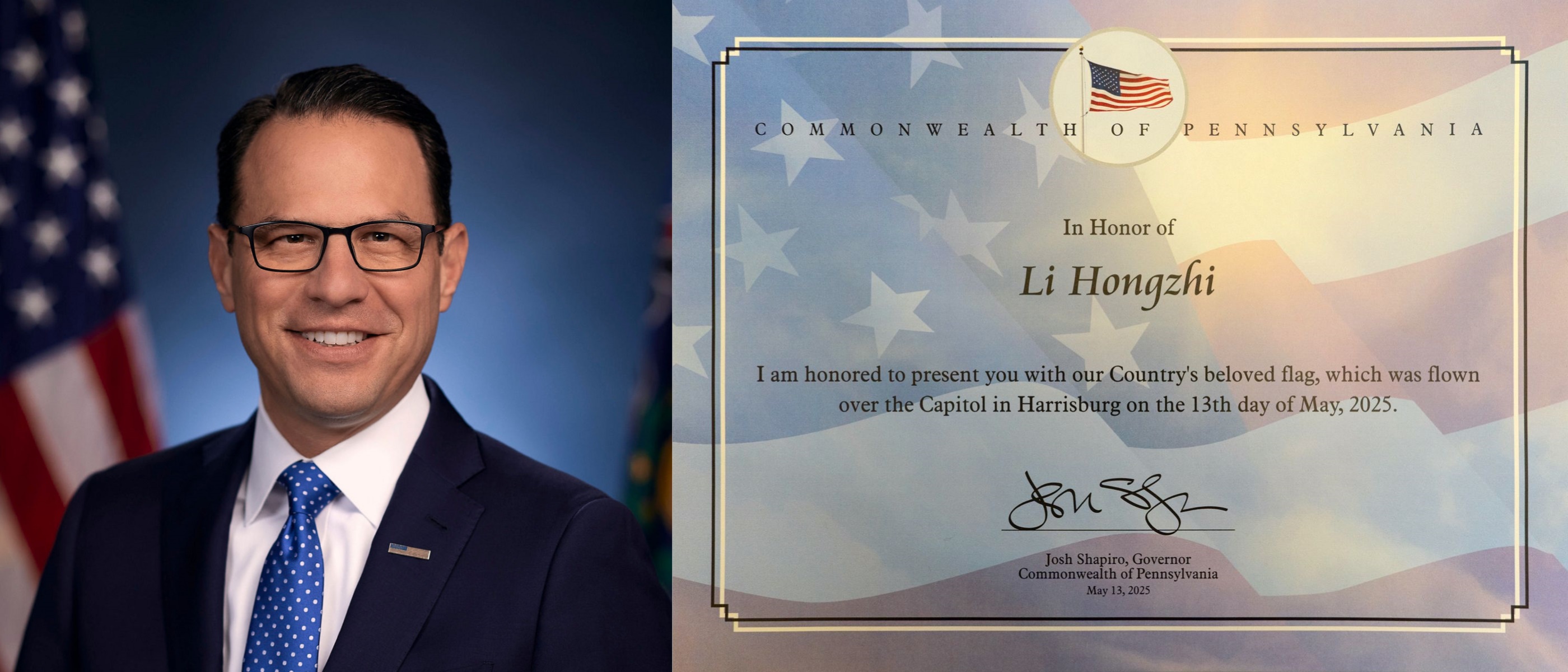 五月十三日“世界法轮大法日”当天,宾州州长乔什·夏皮罗为此颁发证书。“向李洪志先生致敬!我很荣幸地将二零二五年五月十三日飘扬在哈里斯堡议会大厦上空,我们将我们深爱的国旗呈献给您。”