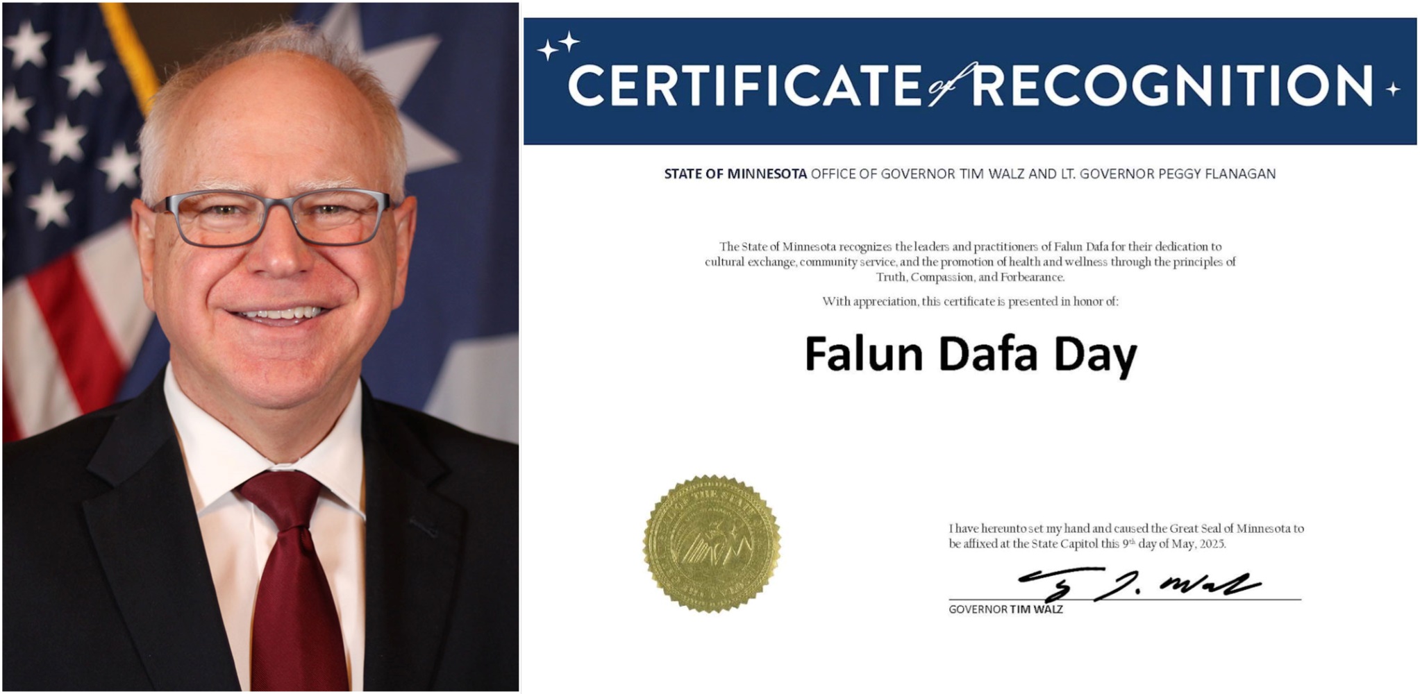 明尼苏达州州长蒂姆‧沃尔兹颁发褒奖。他在褒奖令中说:“明尼苏达州认可法轮大法的创始人及修炼者们以真、善、忍为准则推进文化交流,社区服务,和身心健康。为表感激,特颁发此证书,以表彰‘法轮大法日’。”