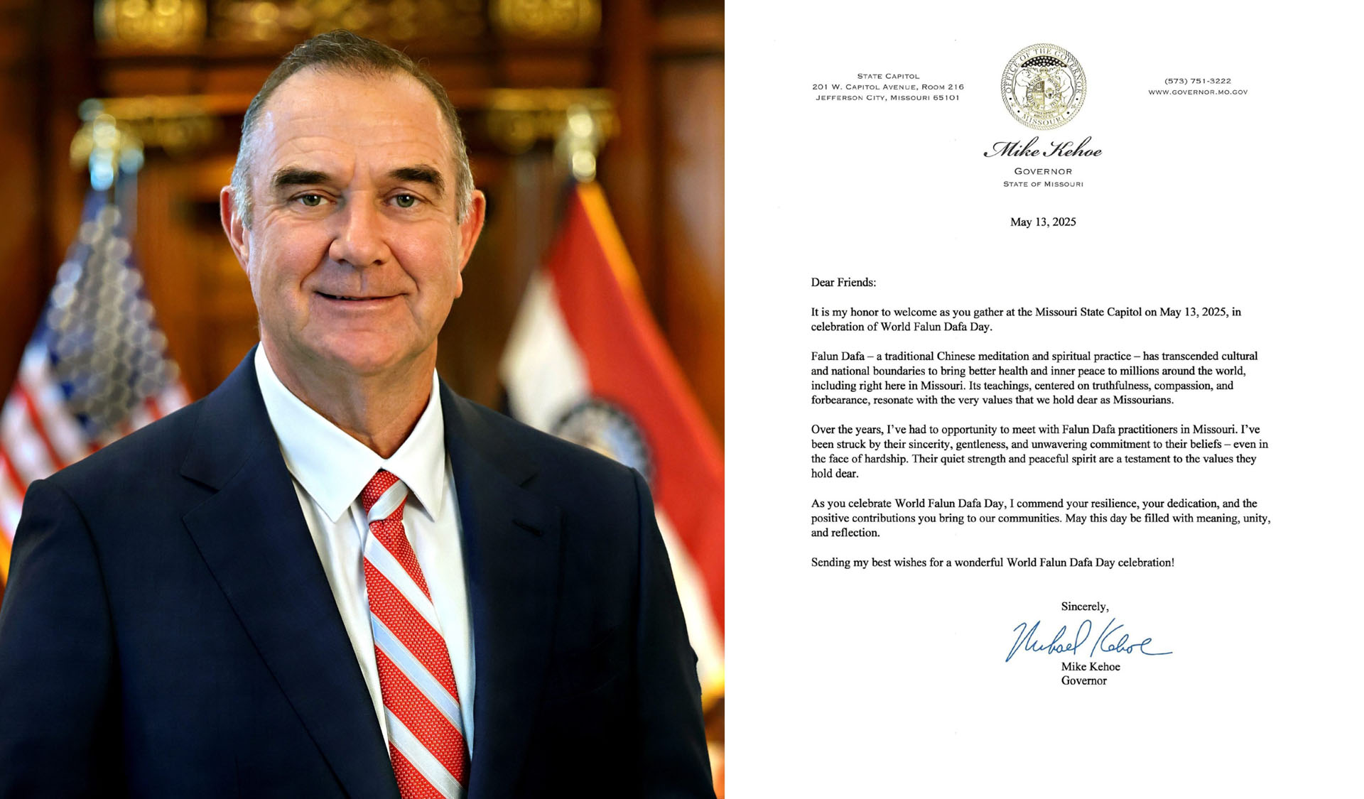 密苏里州州长迈克·基霍发来贺信说:“我很荣幸地欢迎你们于二零二五年五月十三日聚集在密苏里州议会大厦,庆祝‘世界法轮大法日’。