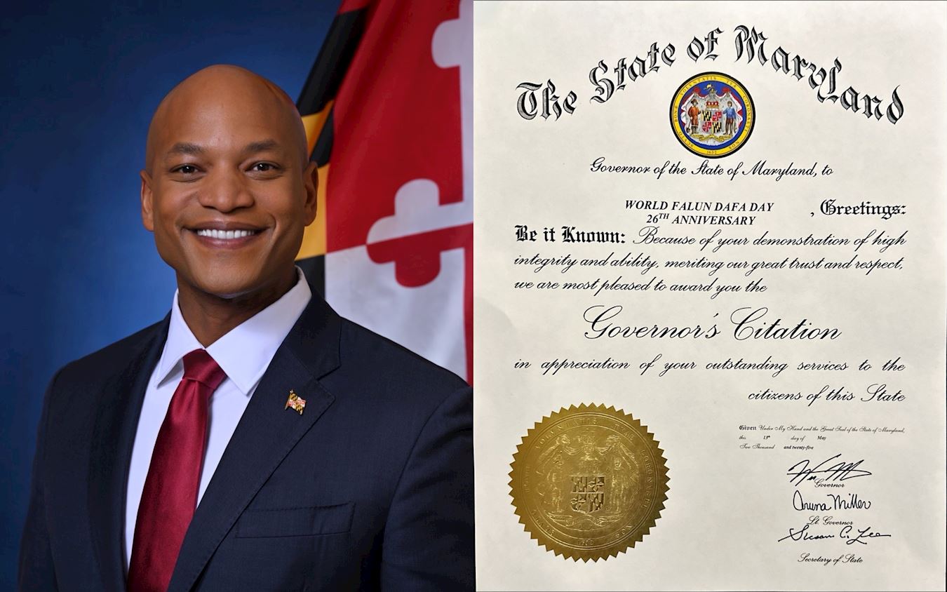 马里兰州州长韦斯·摩尔颁发州长嘉奖令,恭贺第二十六届世界法轮大法日。摩尔州长说:“因为你们(法轮功学员)展现了高度的诚信和能力,赢得了我们极大的信任和尊重,我们非常高兴地授予你们州长嘉奖令,感谢你们为本州公民所作出的杰出服务。”
