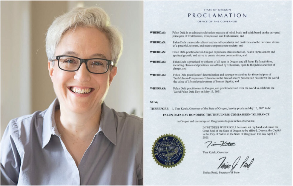 俄勒冈州州长蒂娜·科泰克为五月十三日法轮大法日庆祝活动颁发褒奖,宣布二零二五年五月十三日为俄勒冈“法轮大法日”,并鼓励俄勒冈公民参加庆祝活动,弘扬真、善、忍的普世原则。科泰克州长在褒奖令中说:“法轮大法超越文化和种族界限,为建立一个和平、宽容、更富有同情心的社会作出贡献;法轮功修炼者在遭受严重迫害时坚守真、善、忍原则的决心和勇气向世人展示了生命的宝贵和人类尊严的珍贵。”