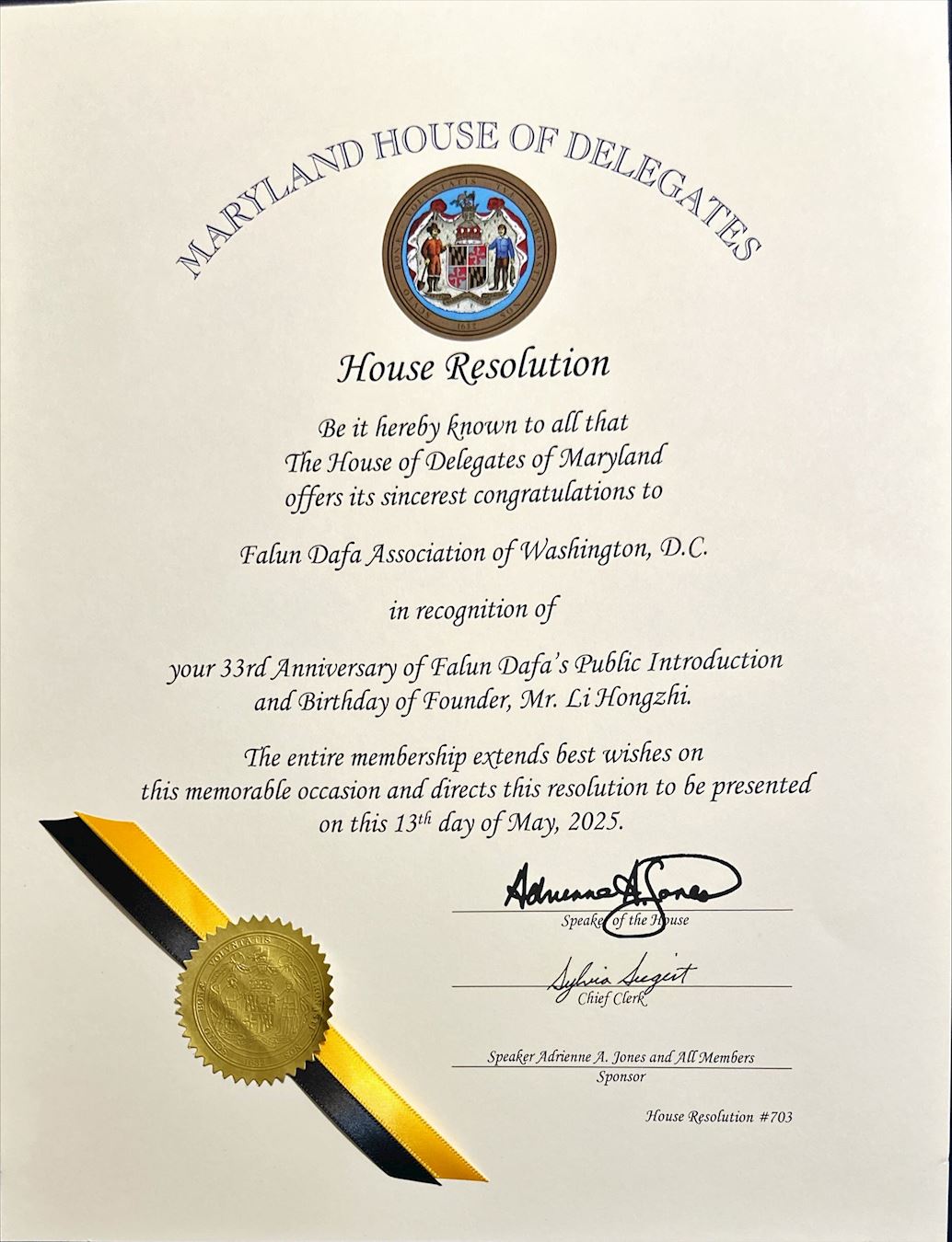 马里兰州众议院通过第703号决议案,表彰法轮大法传世三十三周年,恭贺法轮大法创始人李洪志先生。