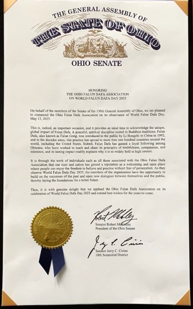 俄亥俄州参议院主席罗伯特·麦考利(Robert McColley)和参议员杰里·西里诺(Jerry C. Cirino)代表州参议院为俄亥俄法轮大法学会颁发褒奖,庆祝世界法轮大法日。