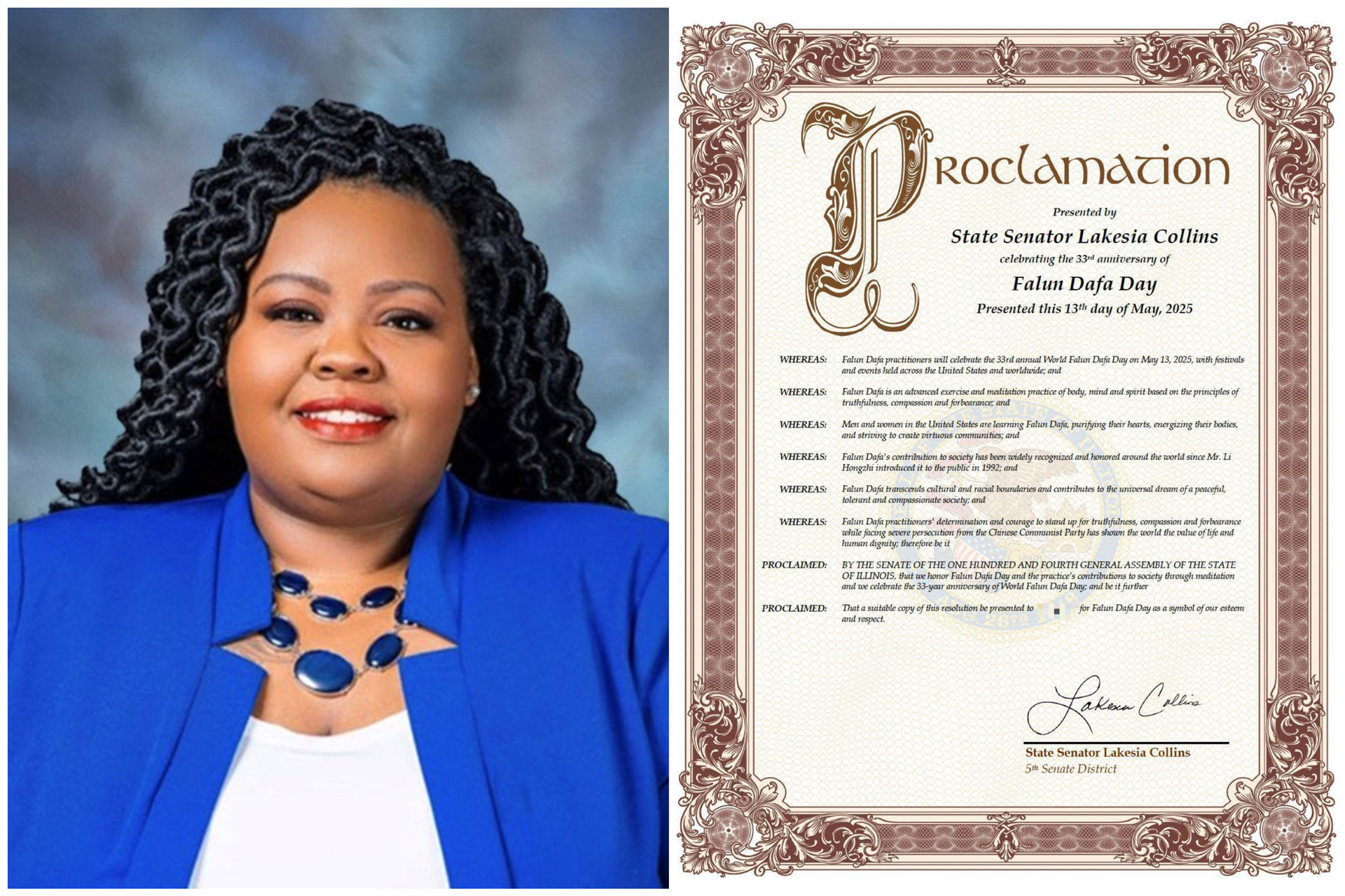 伊利诺伊州参议院通过了由参议员莱克西亚·柯林斯(Lakesia Collins)提出的庆祝法轮大法传世三十三周年的褒奖令,向法轮大法日致敬,认可其对社会的贡献,并庆祝世界法轮大法日二十六周年。