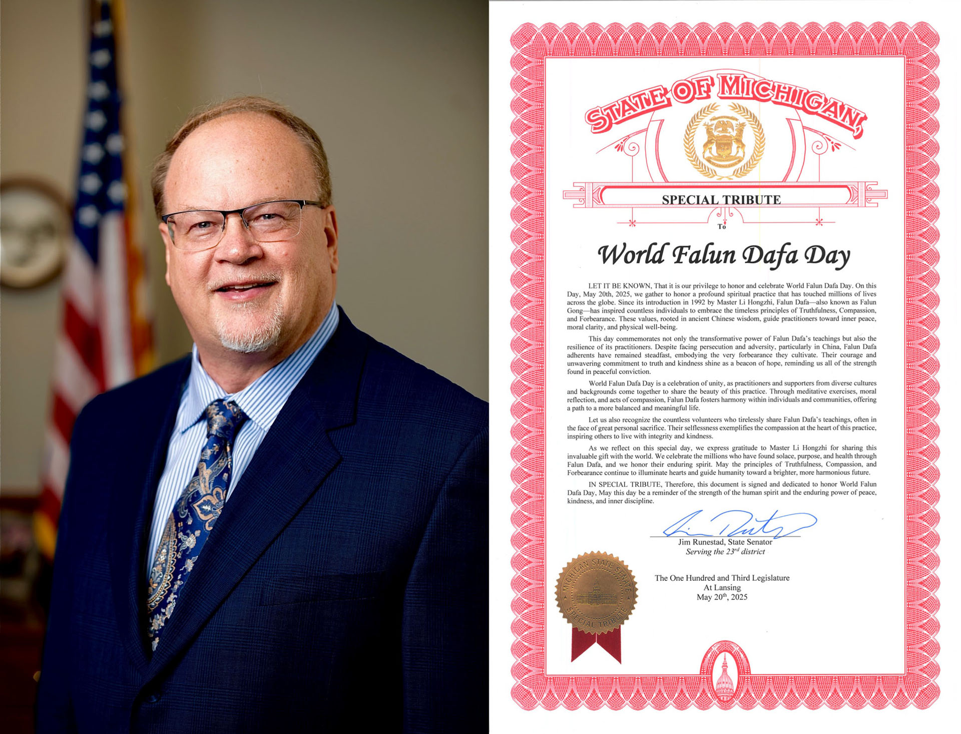 五月二十日,密西根州参议员吉姆·鲁内斯塔德(Jim Runestad)代表第二十三选区,颁发特殊褒奖令,致敬“无私传播法轮大法”的志愿者们,感谢李洪志大师“将如此珍贵的法门带给世界”,并愿世界法轮大法日“这一天成为人类精神坚韧力量与和平、善良、内在修养的恒久象征。