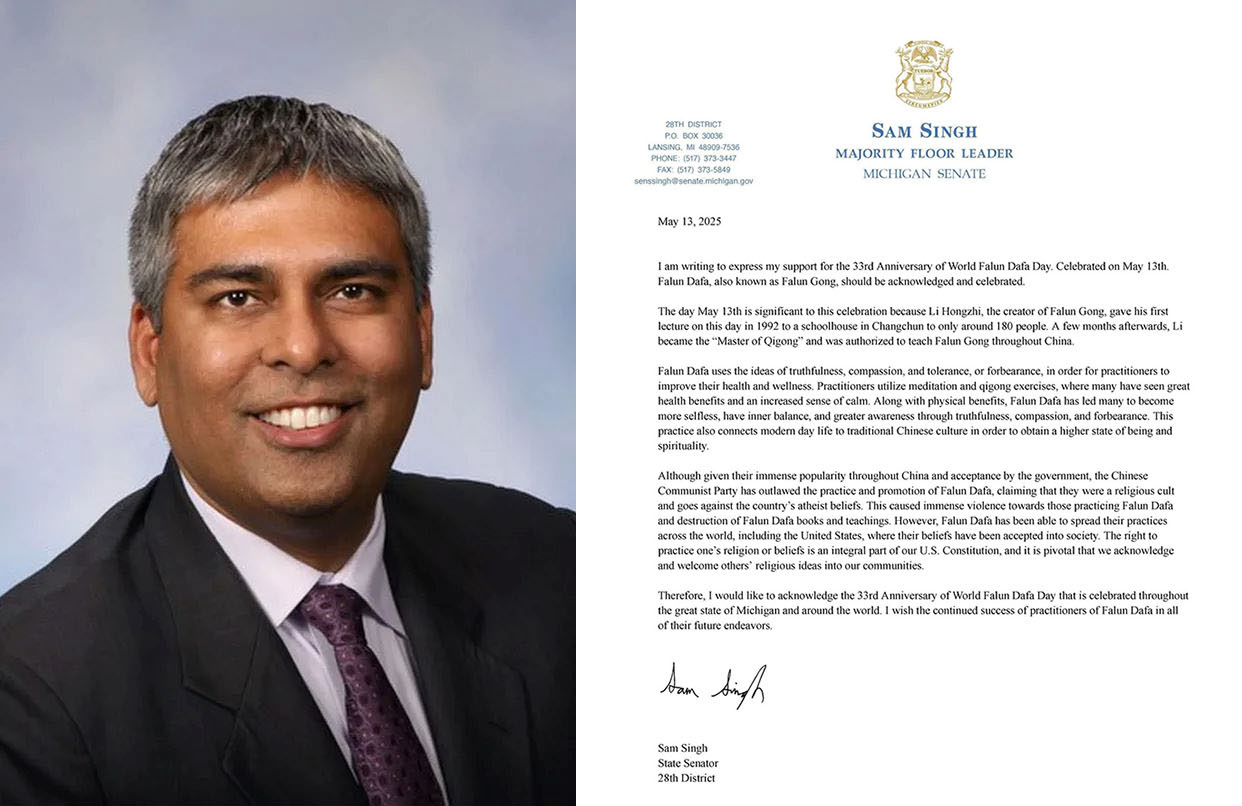 密西根州第二十八选区州参议员萨姆·辛格发来正式信函,表达他对法轮大法的支持和认可。