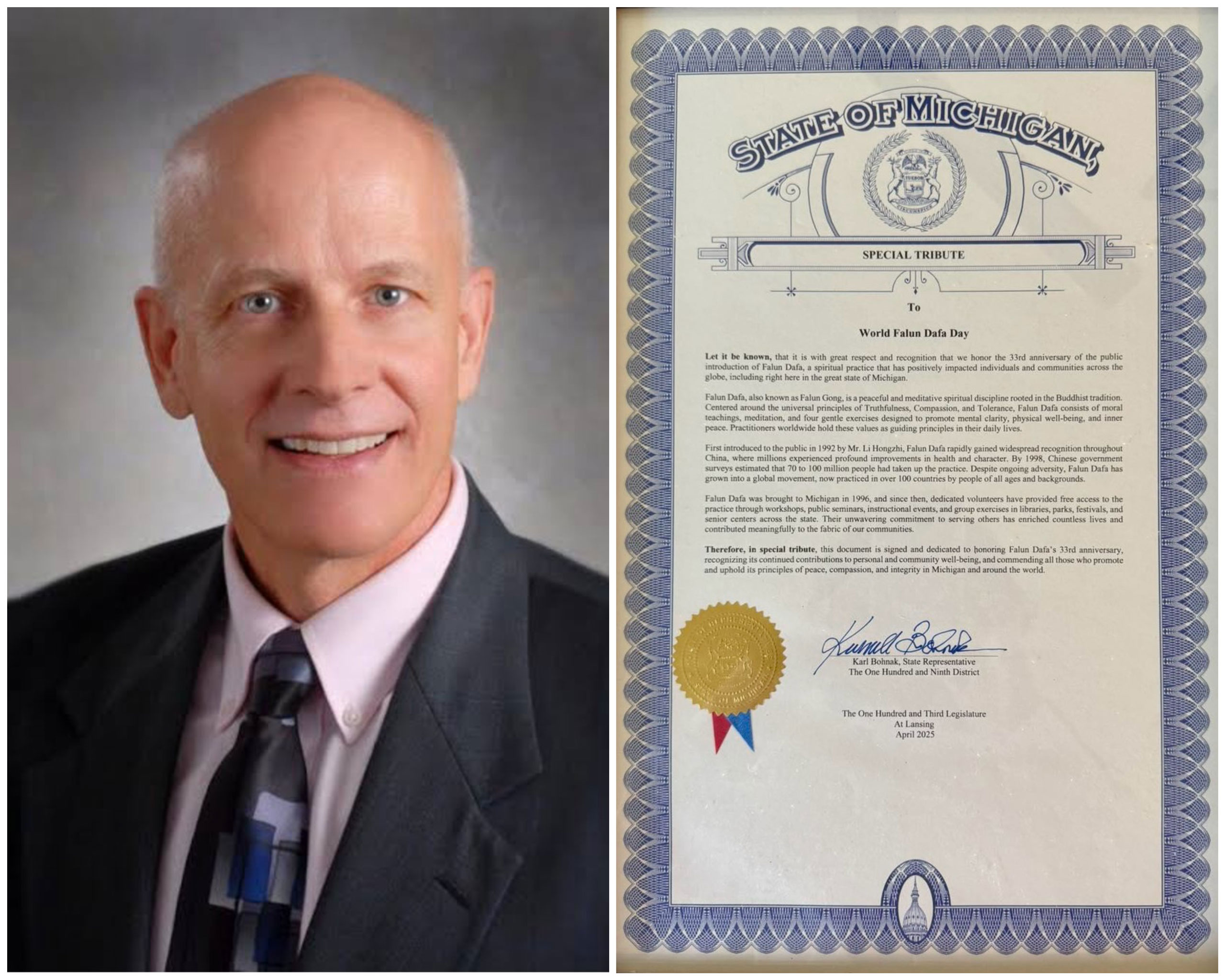 密西根州众议员卡尔·博纳克颁发特别褒奖。褒奖令中说:怀着崇高的敬意和赞赏,纪念法轮大法公开传出的第三十三周年。法轮大法是一种精神修炼方式,对密西根州以及世界各地的个人和社群产生了积极的影响,带来了提升和正能量。