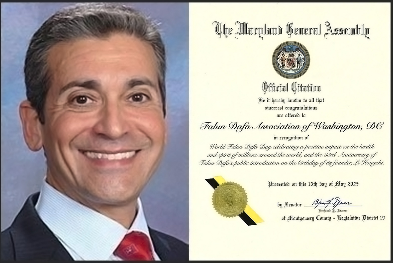 马里兰州参议员本杰明·克雷默(Benjamin F. Kramer)颁发褒奖,表彰第二十六届世界法轮大法日,庆祝大法给世界各地的数百万人的身心健康带来积极正面的影响,同时表彰法轮大法传世三十三周年。