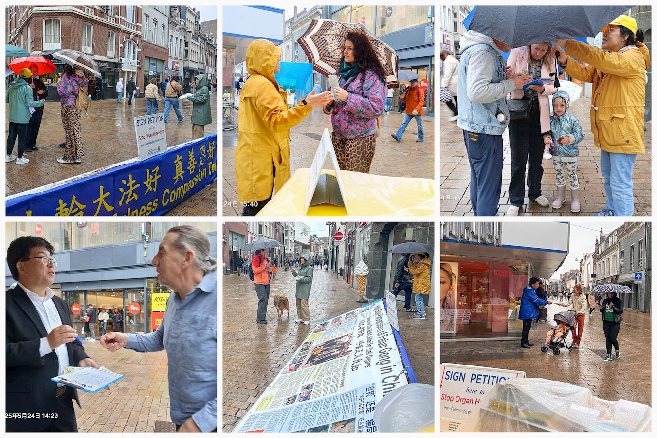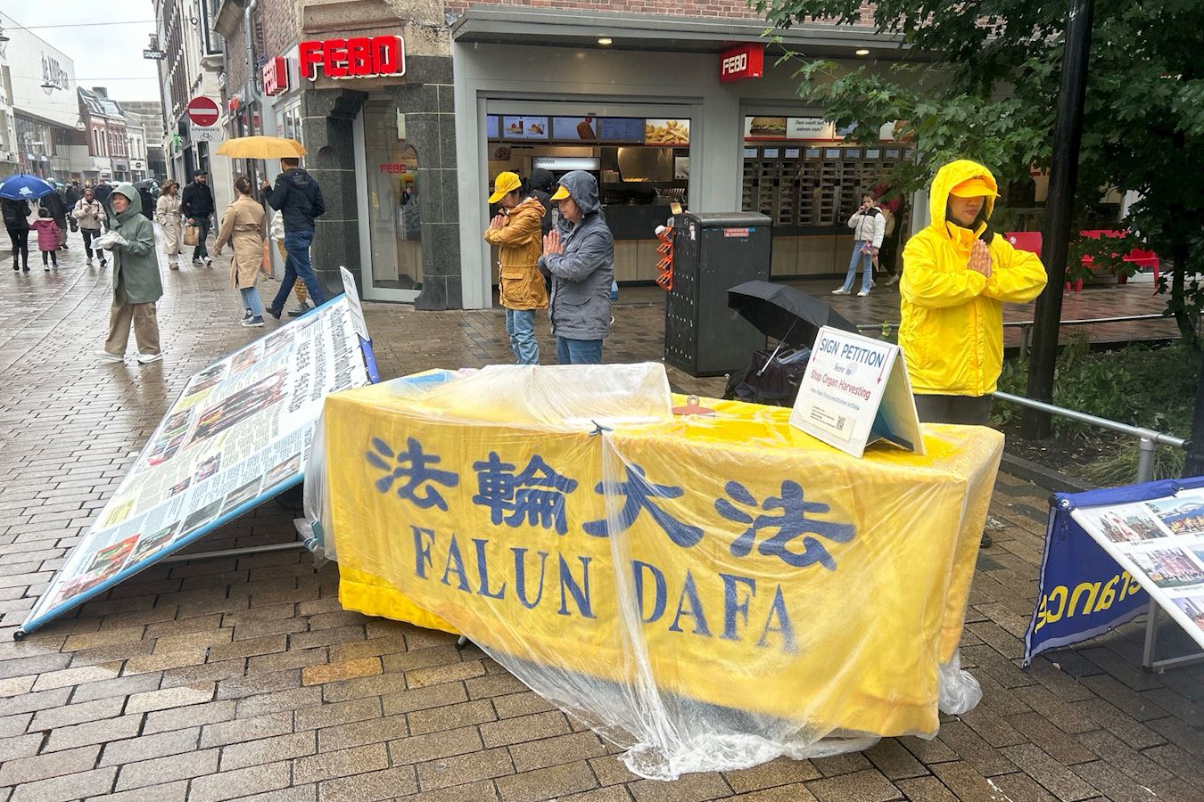 学员们在蒂尔堡繁华的商业街(Heuvelstraat)布置“法轮大法弘传世界”和“中共酷刑折磨法轮功学员”的展板,并向过往市民及游客展示法轮功五套功法,发放真相传单,征集反对中共活摘法轮功学员器官的签名。