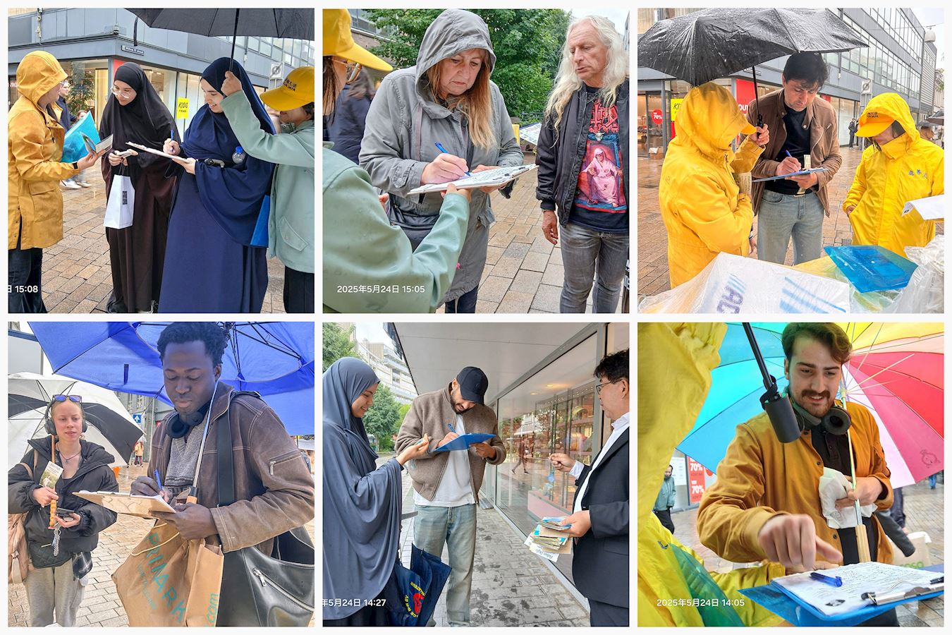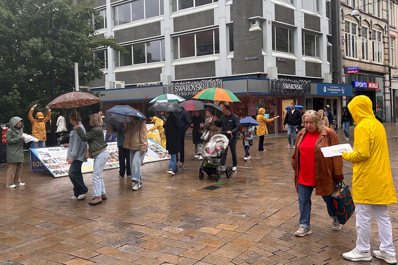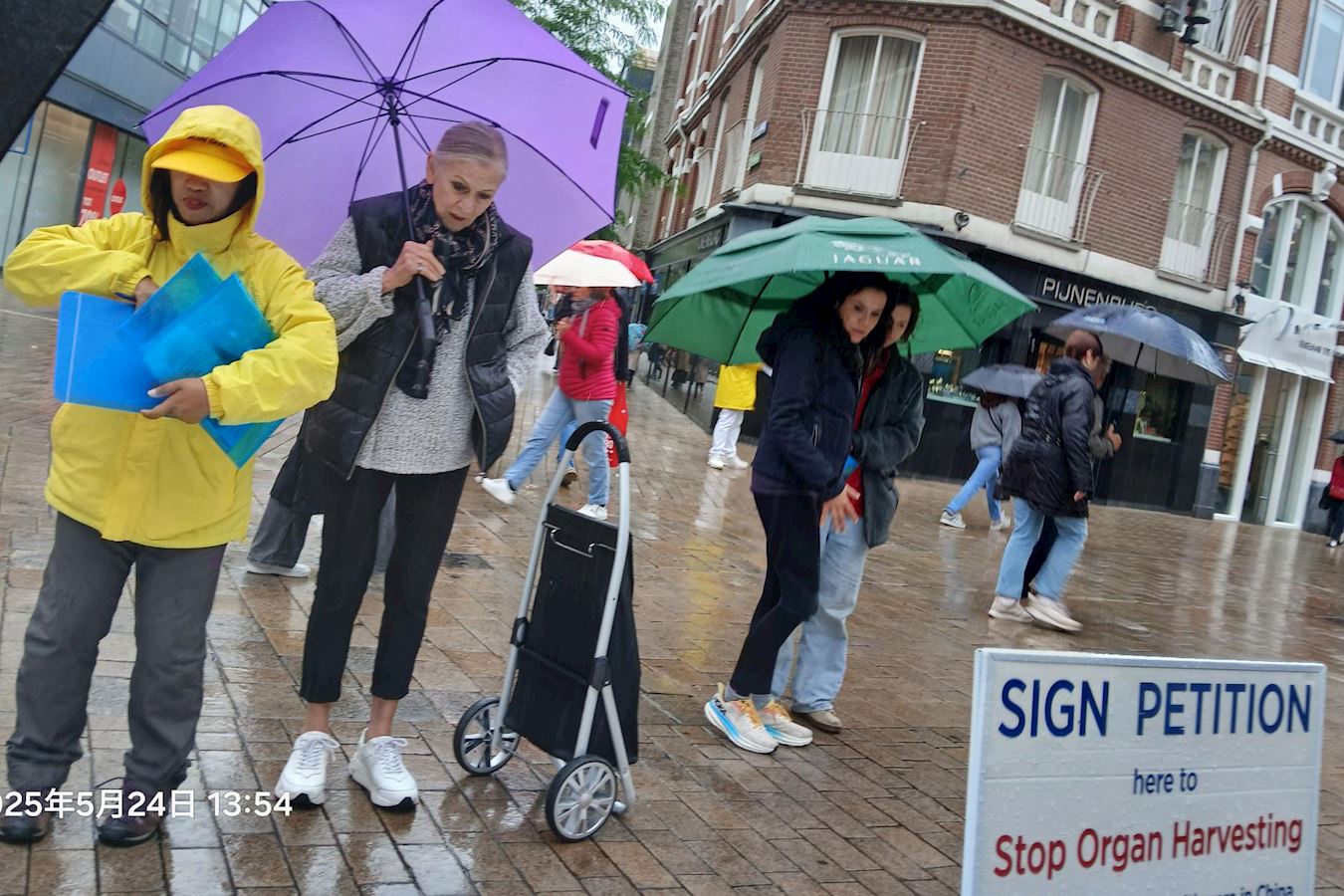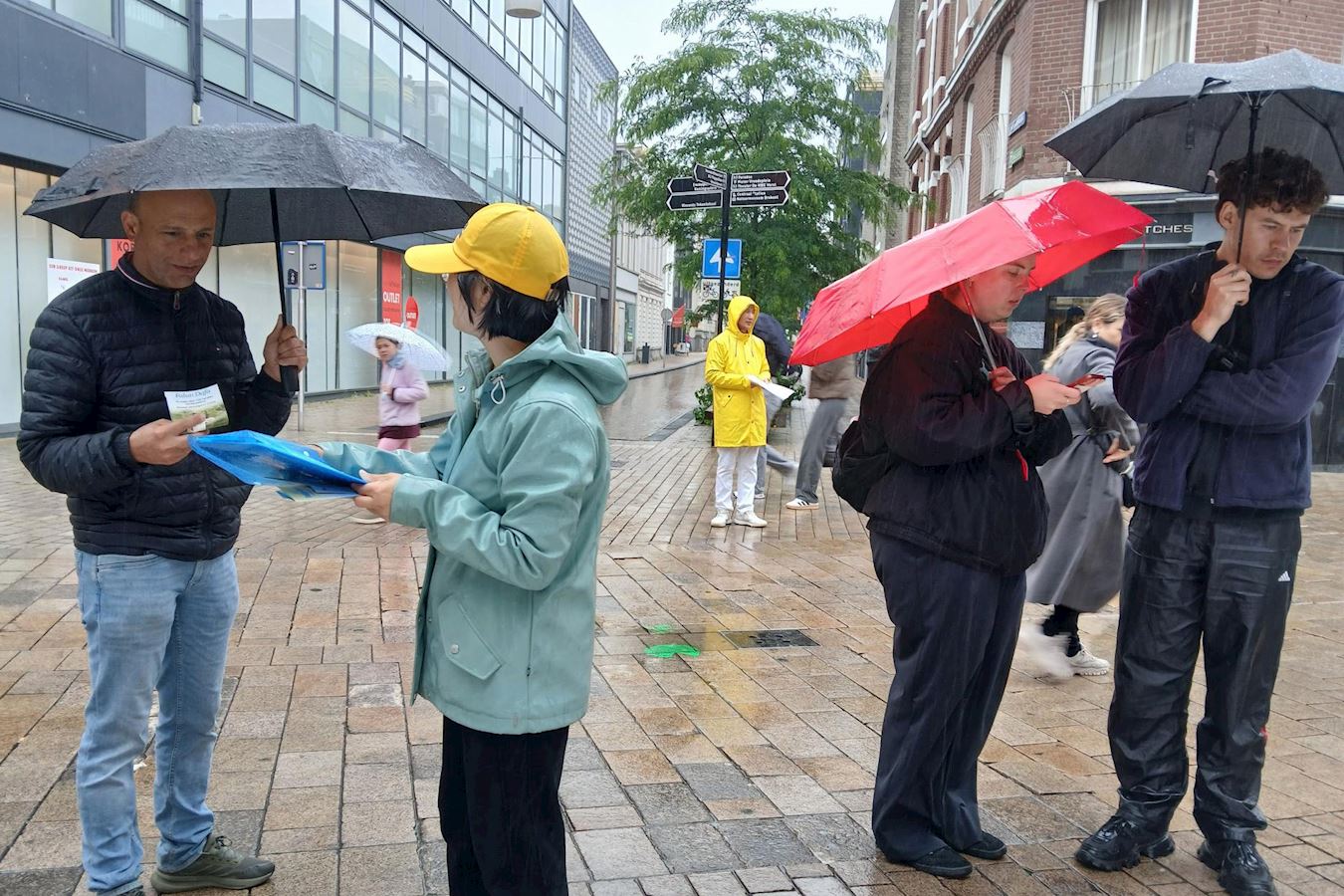 午后,阴沉的天空淅淅沥沥下起了小雨,随后,雨势时大时小,一直伴随到讲真相活动的结束。尽管如此,行人们还是被学员们冒雨炼功的祥和所吸引,驻足观看。络绎不绝的行人接过学员递来的资料,有的边走边看,有的排队签名。人们佩服法轮功学员在雨中坚守,感谢学员把法轮大法的美好传递给他们。
