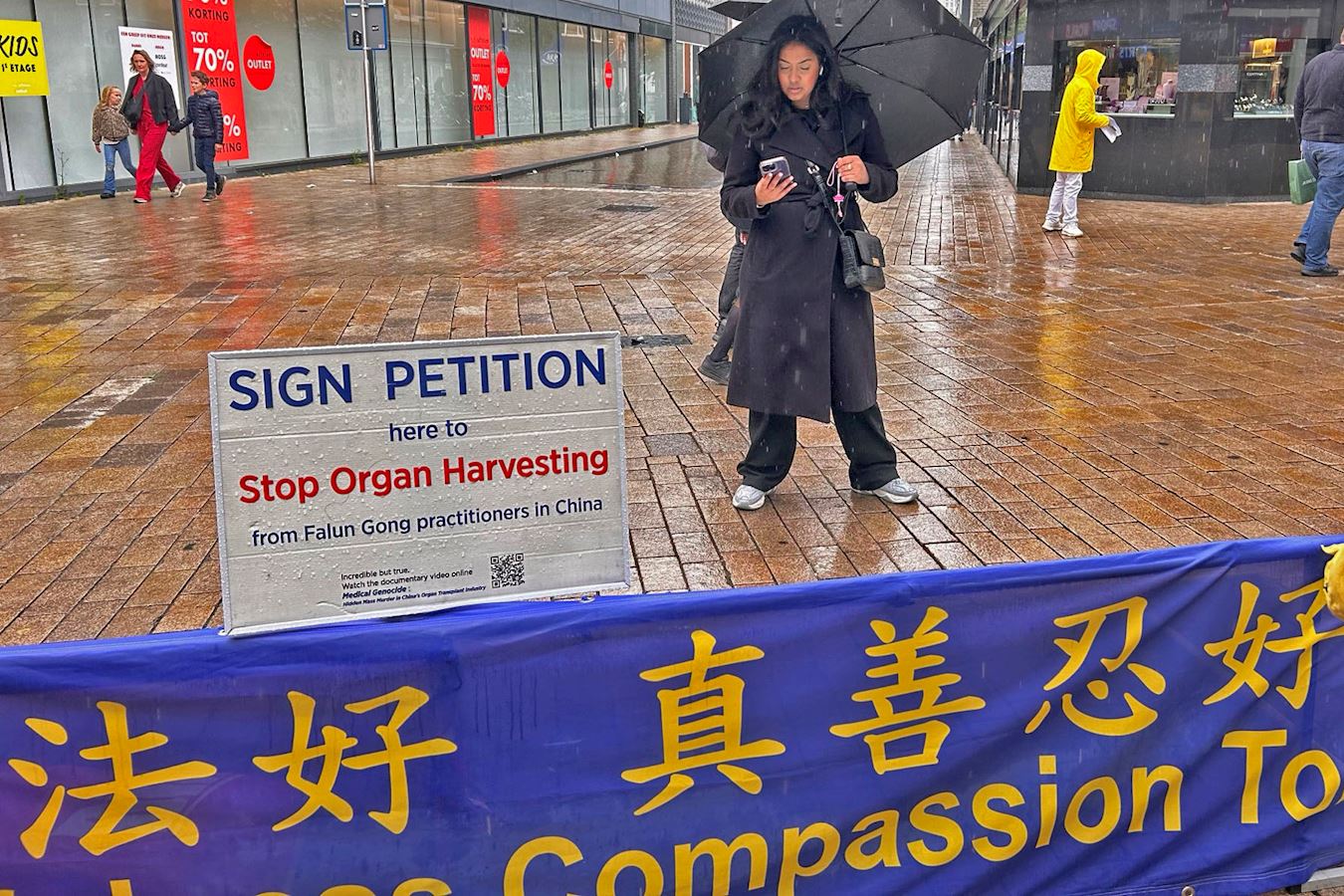 她很震惊法轮功学员告诉她的消息,在征签表上签名后,立即掏出手机记录自己在真相展板上看到的消息,她对告诉她真相的学员说:“感谢你们站在雨里,感谢你们告诉我这些!”