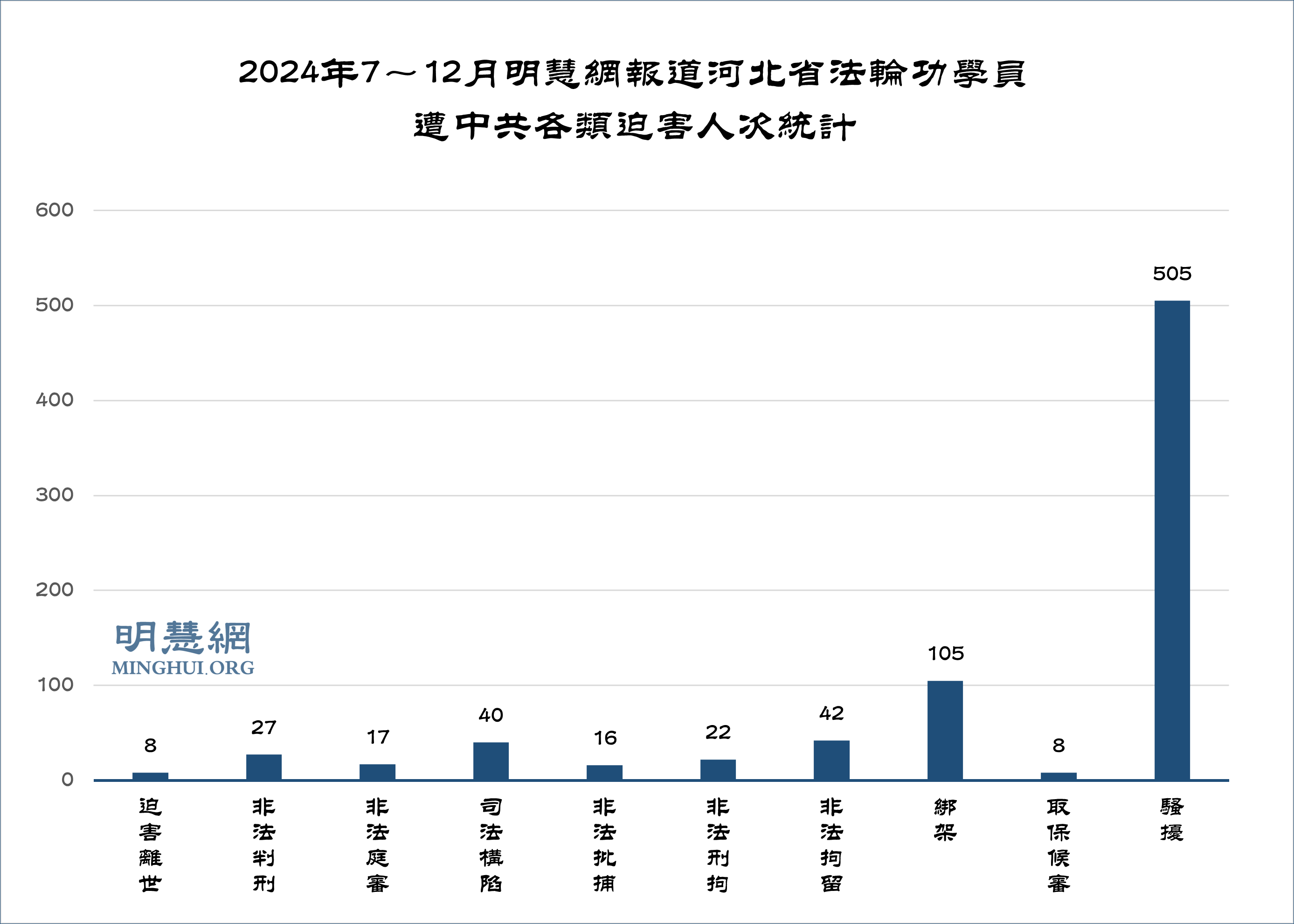 ![]() 图2:2024年7~12月明慧网报道河北省法轮功学员遭中共各类迫害人次统计 |