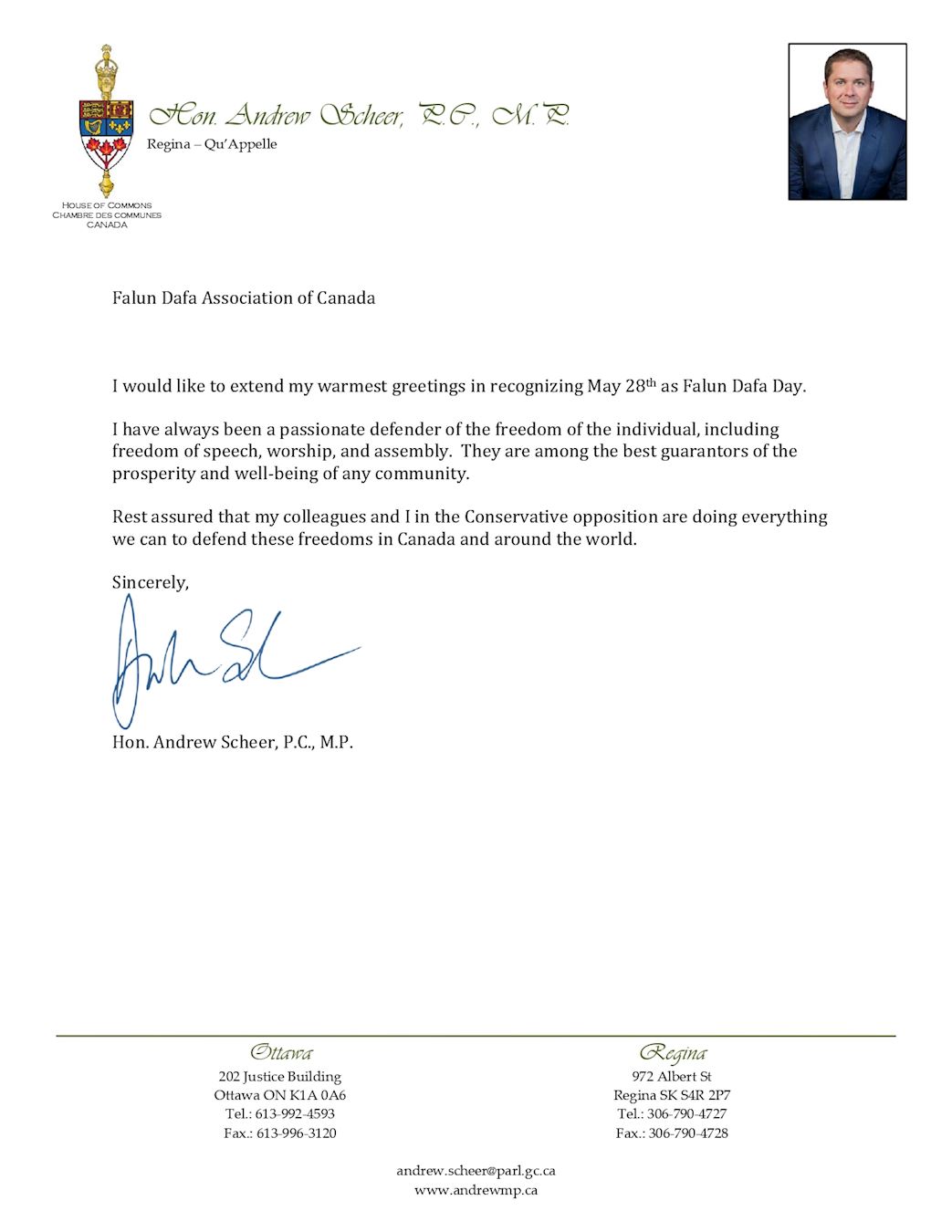 加拿大反对党代理领袖安德鲁·希尔(Andrew Scheer,P.C., M.P.)在贺信中说:“我谨致以最诚挚的问候,以表彰五月二十八日为法轮大法日。