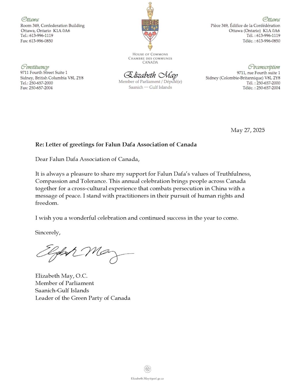 加拿大绿党(Green Party)党领伊丽莎白·梅(Elizabeth May)在贺信中说:“我一直很高兴表达我对法轮大法真、善、忍价值观的支持。这一年度庆典将来自加拿大各地的人们汇聚在一起,共同参与一场跨文化的盛会,弘扬和平的信息,并反对在中国对信仰者的迫害。我支持修炼者们在人权与自由方面的不懈追求。