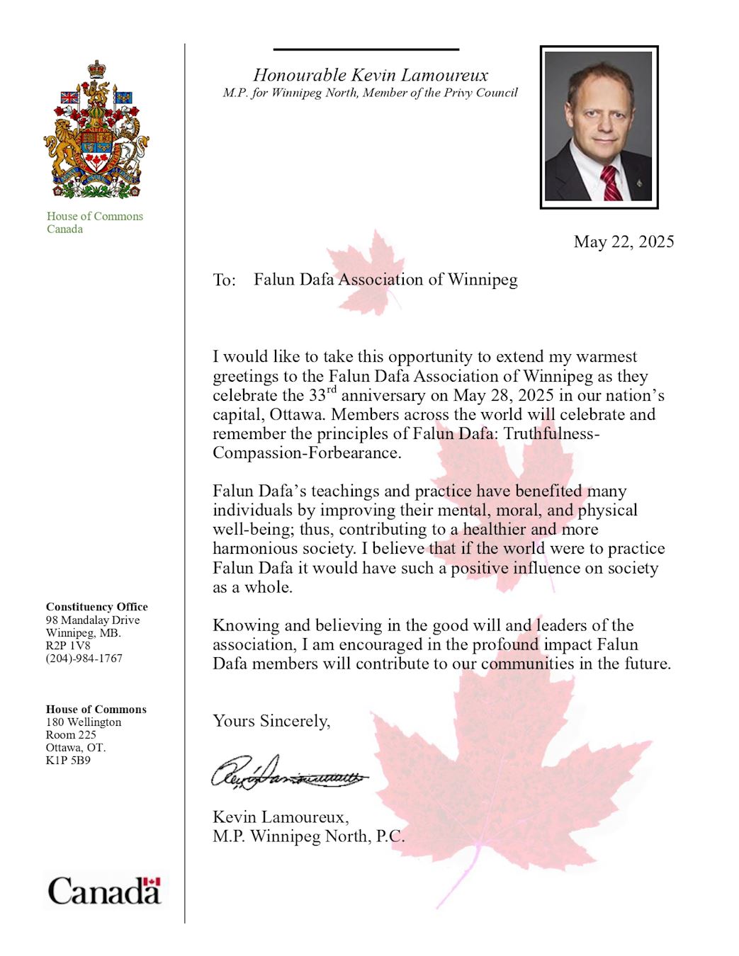 温尼伯北选区(Winnipeg North)国会议员凯文·拉莫鲁(Kevin Lamoureux)在贺信中说:“我谨借此机会,向温尼伯法轮大法协会致以最诚挚的问候,祝贺你们于二零二五年五月二十八日在我们国家首都渥太华庆祝法轮大法弘传33周年。全球各地的修炼者将共同庆祝,并铭记法轮大法的原则:真、善、忍。