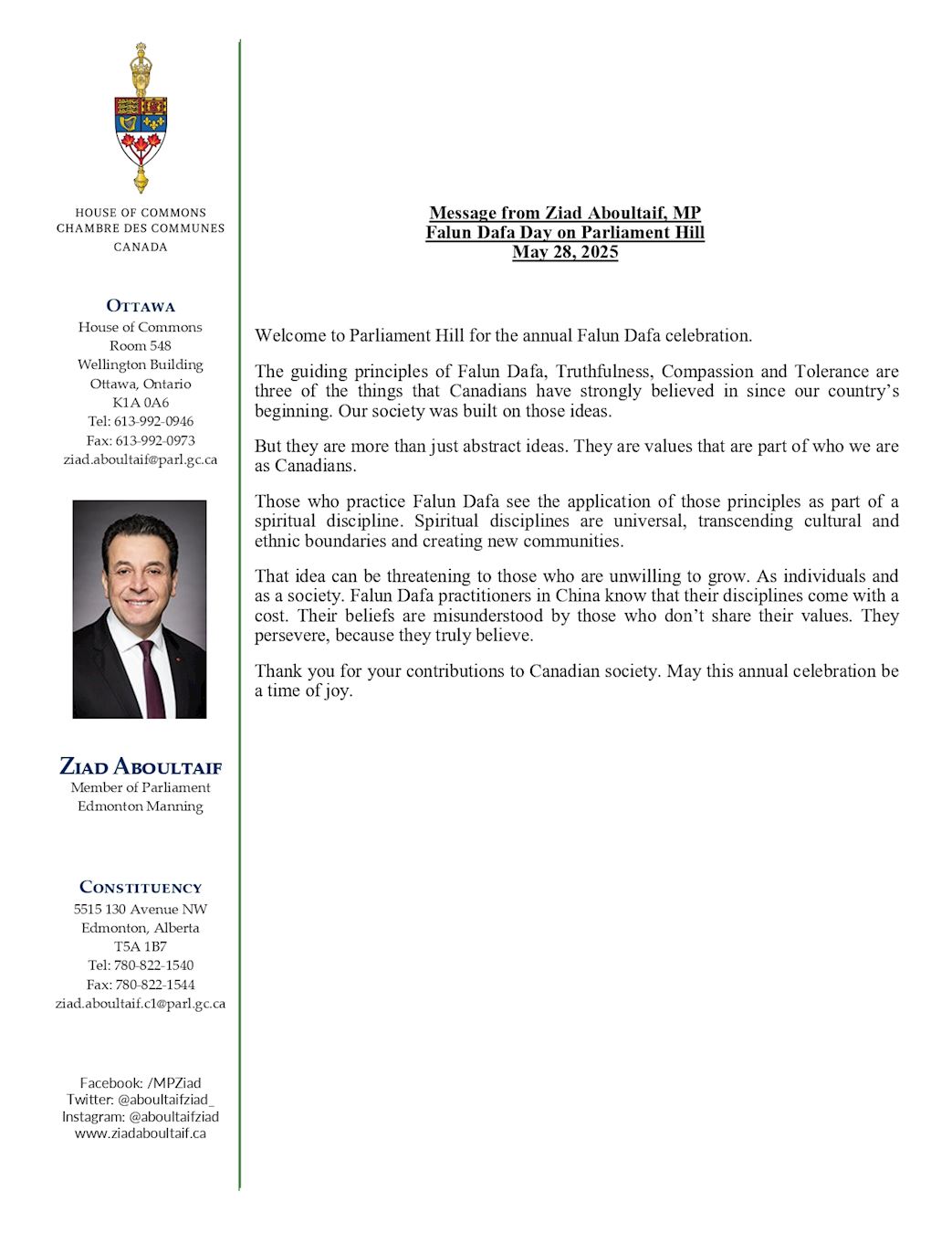 埃德蒙顿联邦(Edmonton Manning)国会议员齐亚德·阿布泰夫(Ziad Aboultaif)在贺信中说:“欢迎来到国会山,参加一年一度的法轮大法庆祝活动。