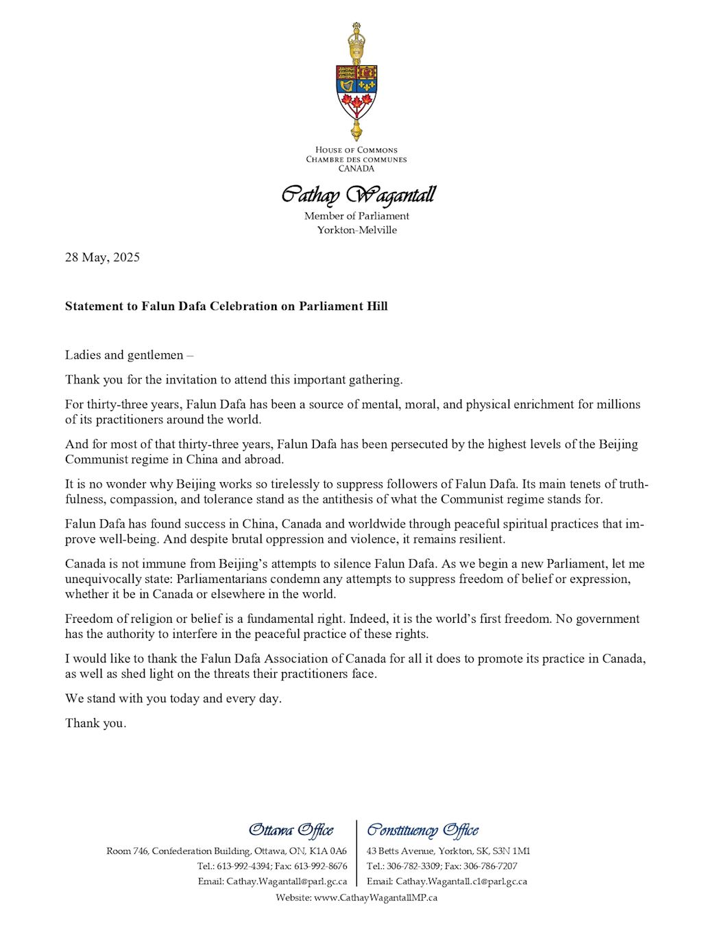 来自萨斯喀彻温省,代表约克顿-梅尔维尔区(Yorkton—Melville)国会议员国泰·瓦甘托尔(Cathay Wagantall)在贺信中说:“三十三年来,法轮大法一直是全球数百万修炼者在心理、道德与身体上的修养源泉。