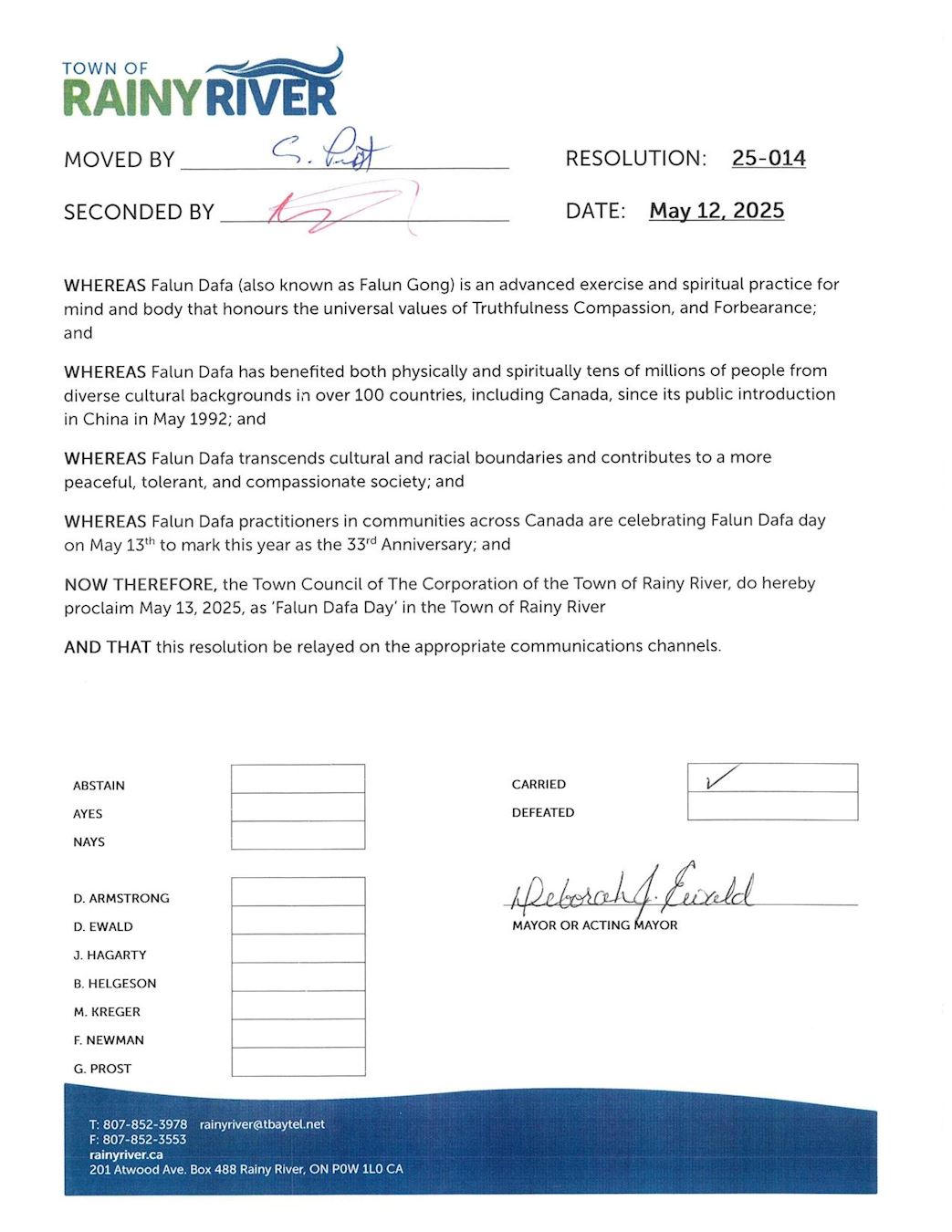 “因此,雷尼里弗镇议会特此宣布二零二五年五月十三日为雷尼里弗镇的‘法轮大法日’。”