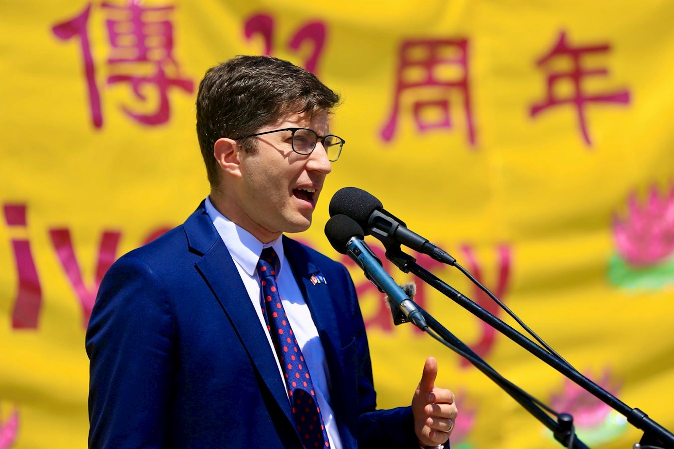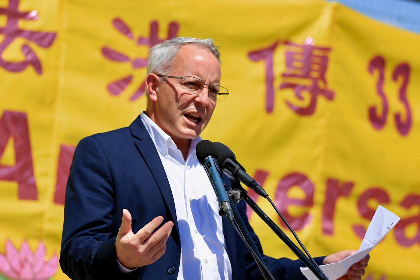 保守党国防事务影子内阁部长、国会议员比赞(James Bezan)在发言中恭贺法轮大法弘传三十三周年。他说:“法轮大法的核心原则——真、善、忍,实际上也是我们作为加拿大人的原则。”