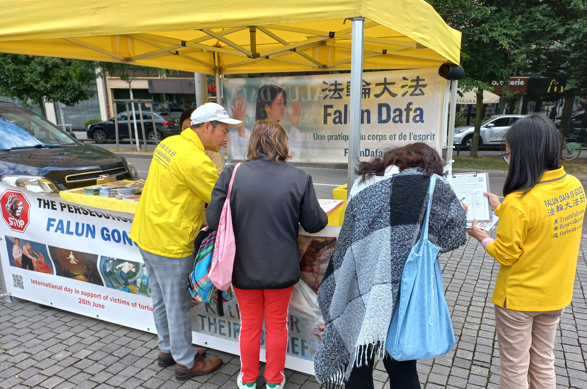 ![]() 图1:五月二十五日,在斯特拉斯堡火车站广场上法轮功信息日,人们签名制止中共迫害法轮功。 |