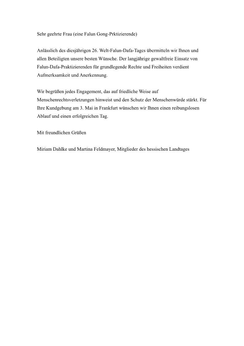 黑森州议会绿党(Die GRüNEN)两位女议员马婷娜•菲尔德迈尔(Martina Feldmayer) 和米莉亚•达尔克(Miriam Dahlke)在贺信中给法轮功学员带来了美好祝愿。