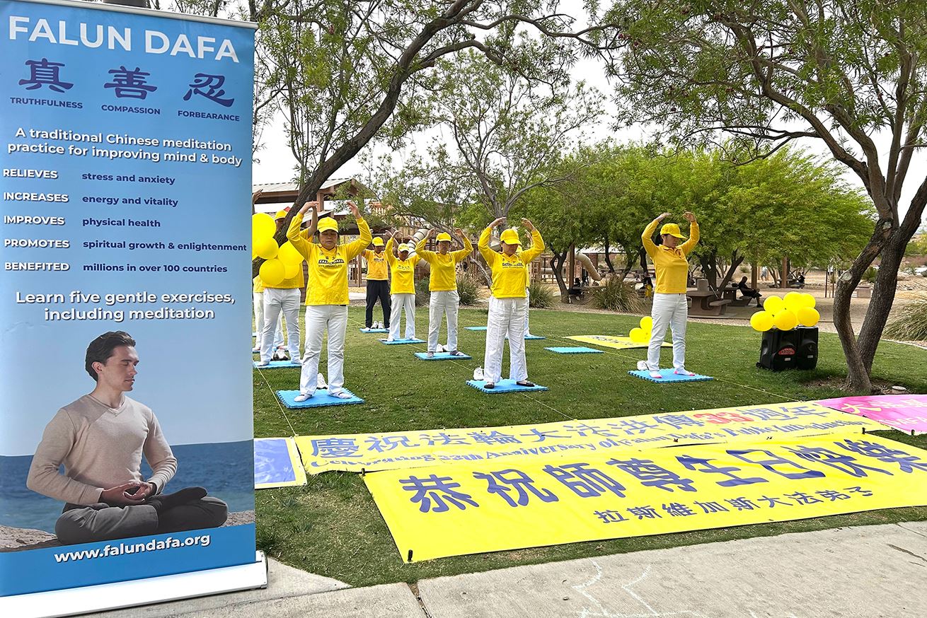 ![]() 图1~3:二零二五年五月三日,美国拉斯维加斯部分法轮功学员在当地的探索公园(ExplorationPeak Park)进行功法展示。 |