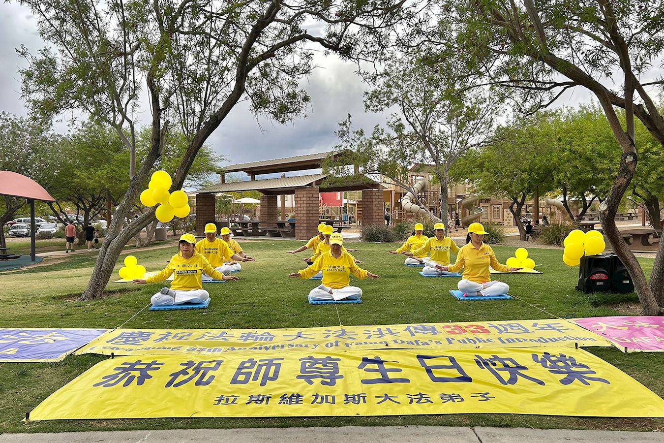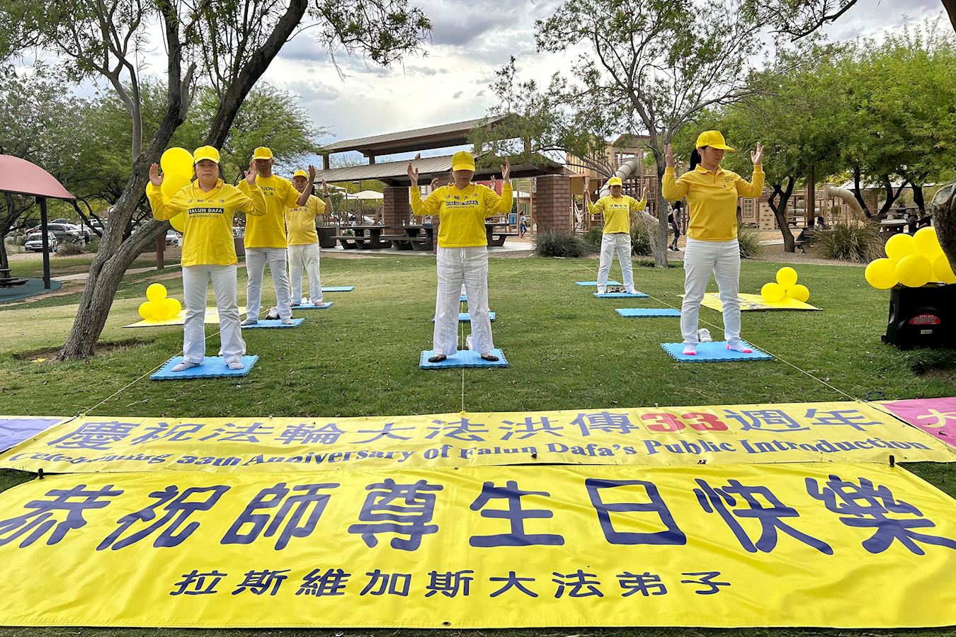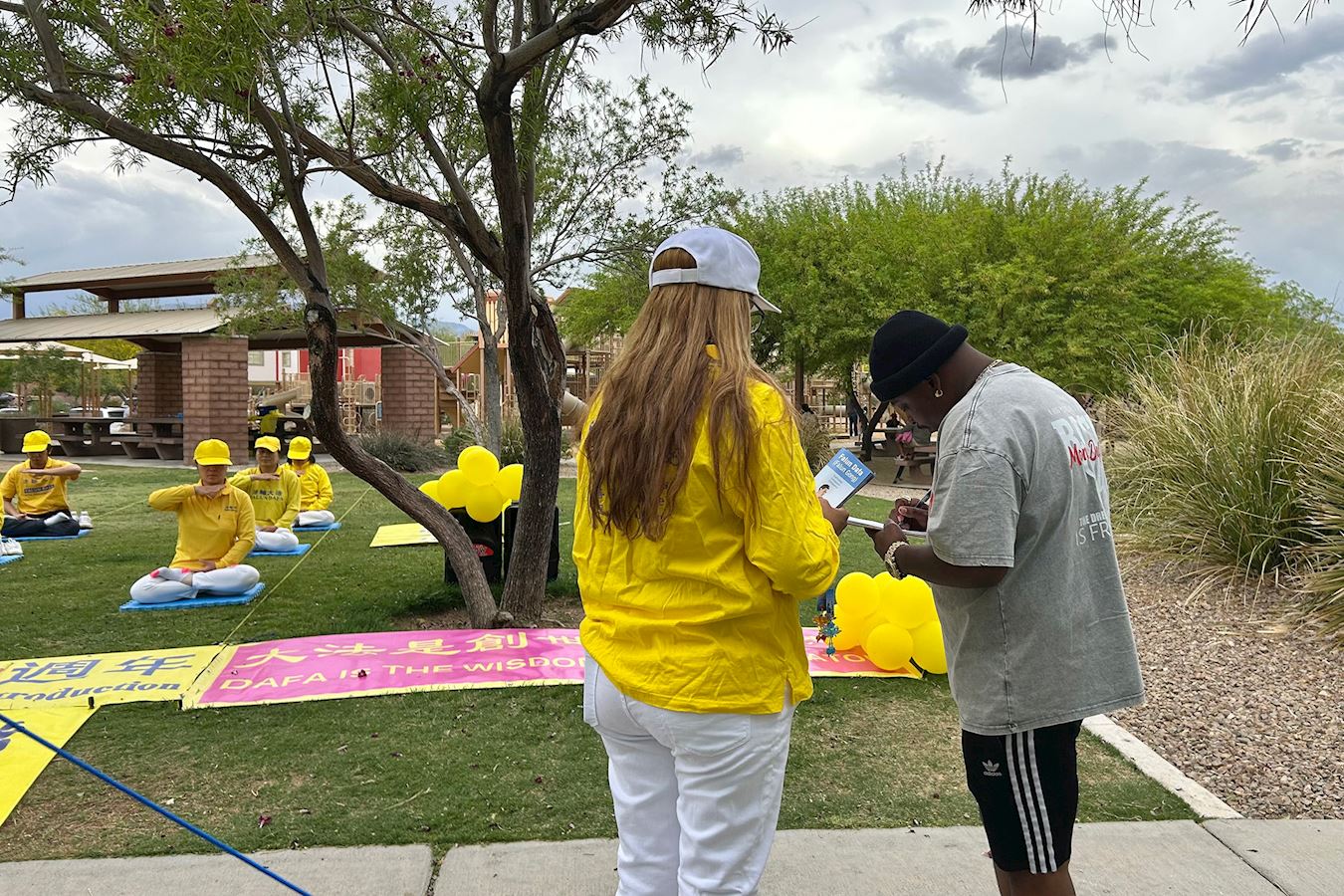 凯蒂(Katie)在当地一家广播电台工作。午后在公园散步时看到学员们正在进行功法展示。学员告诉她今天在这里庆祝师父的生日。法轮功有动功也有打坐,我们每天早晨七点到九点在沙漠微风公园(Desert Breeze Park)炼功。她很感兴趣。”