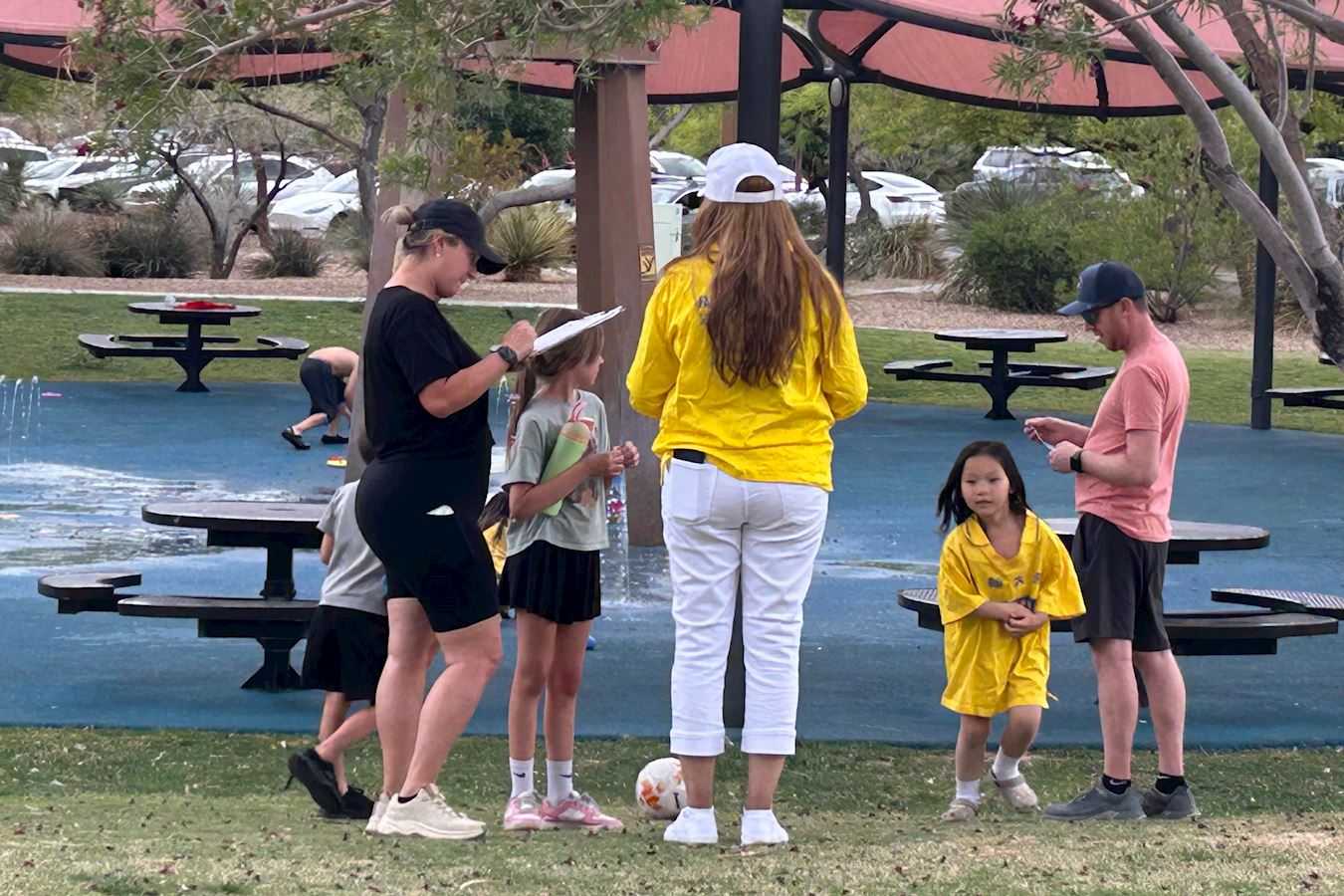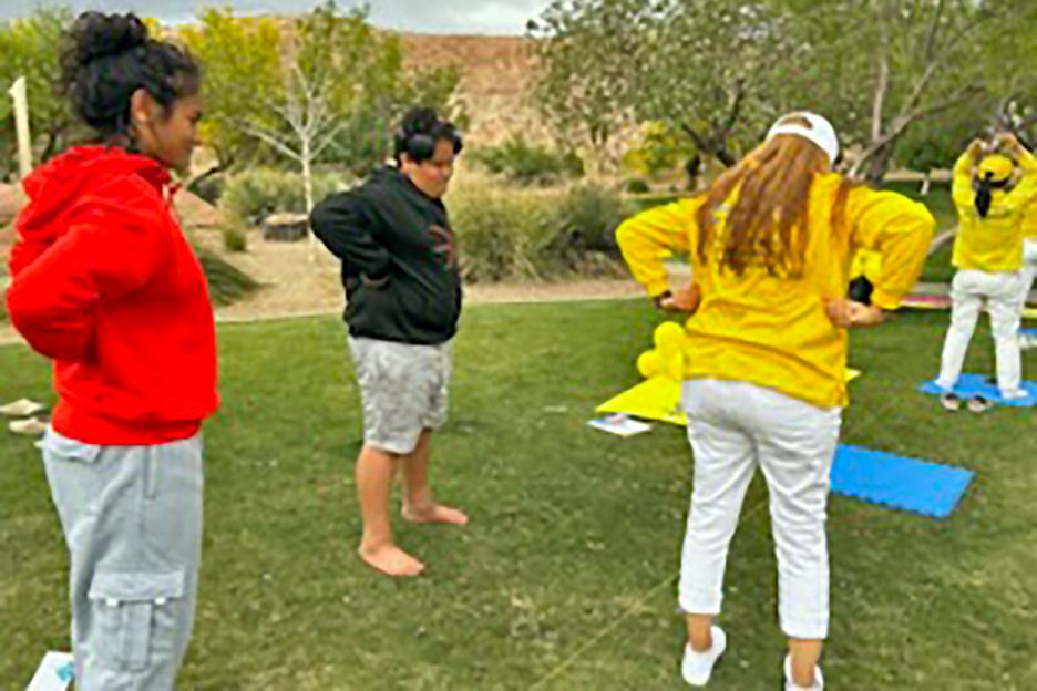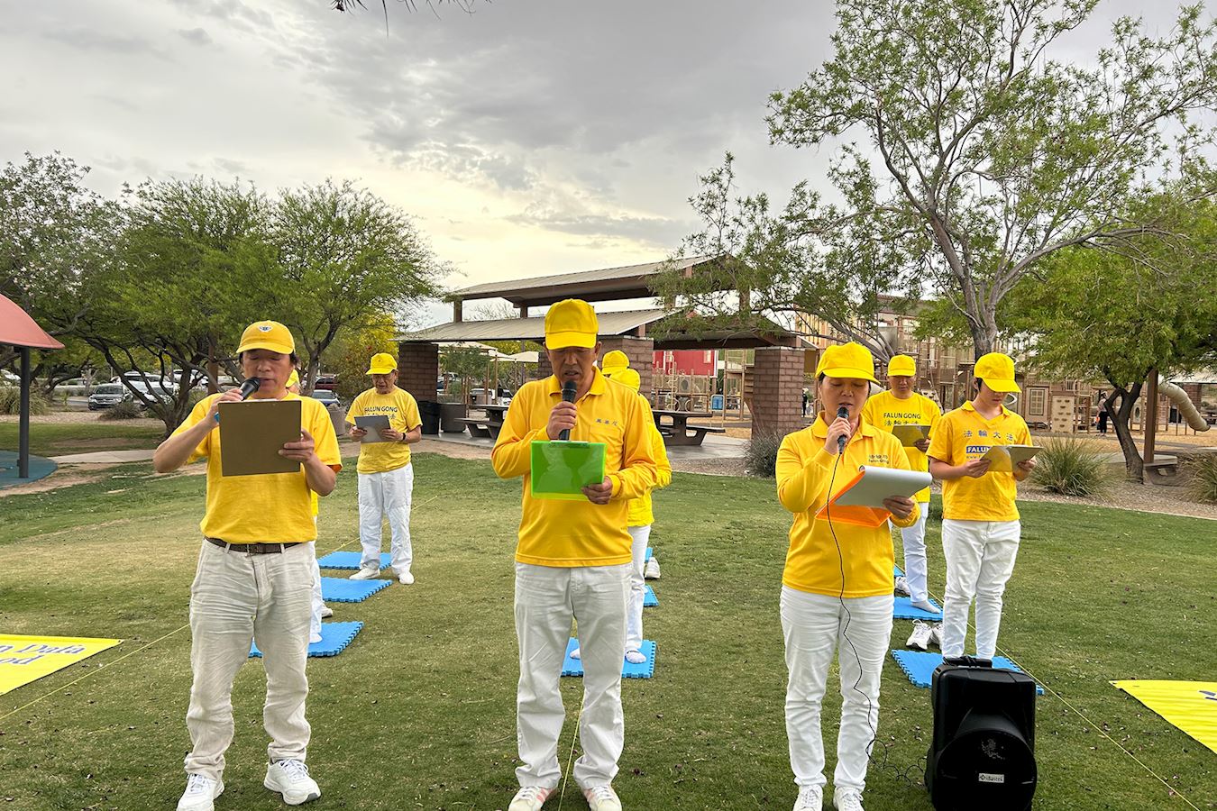 凯蒂(Katie)在当地一家广播电台工作。午后在公园散步时看到学员们正在进行功法展示。学员告诉她今天在这里庆祝师父的生日。法轮功有动功也有打坐,我们每天早晨七点到九点在沙漠微风公园(Desert Breeze Park)炼功。她很感兴趣。”