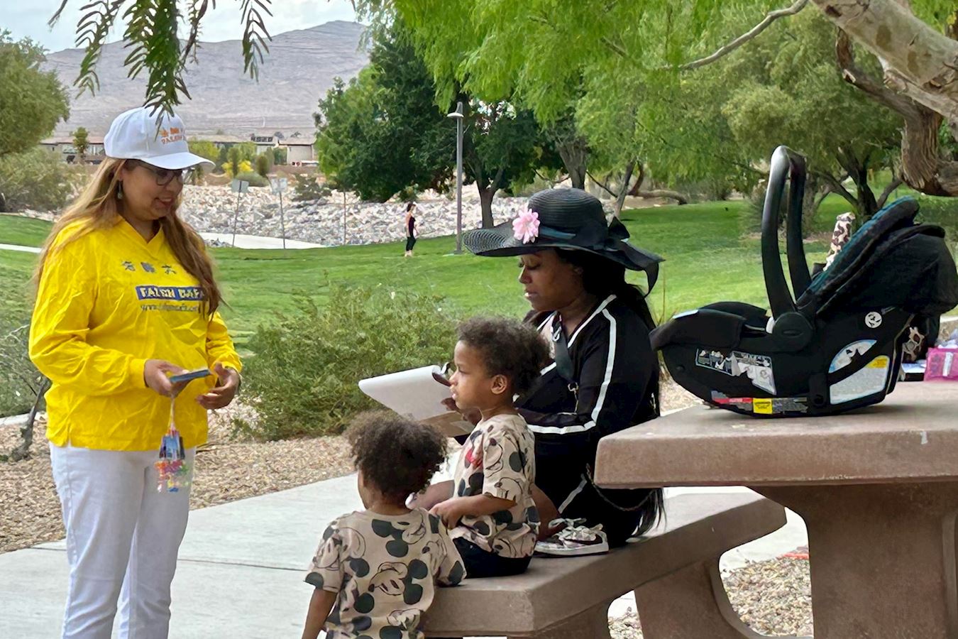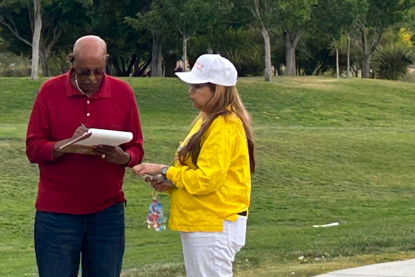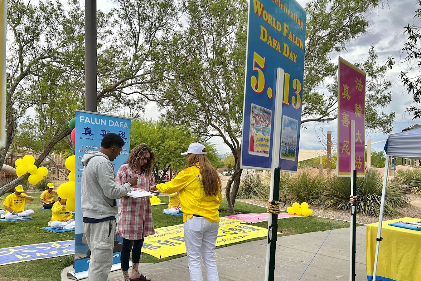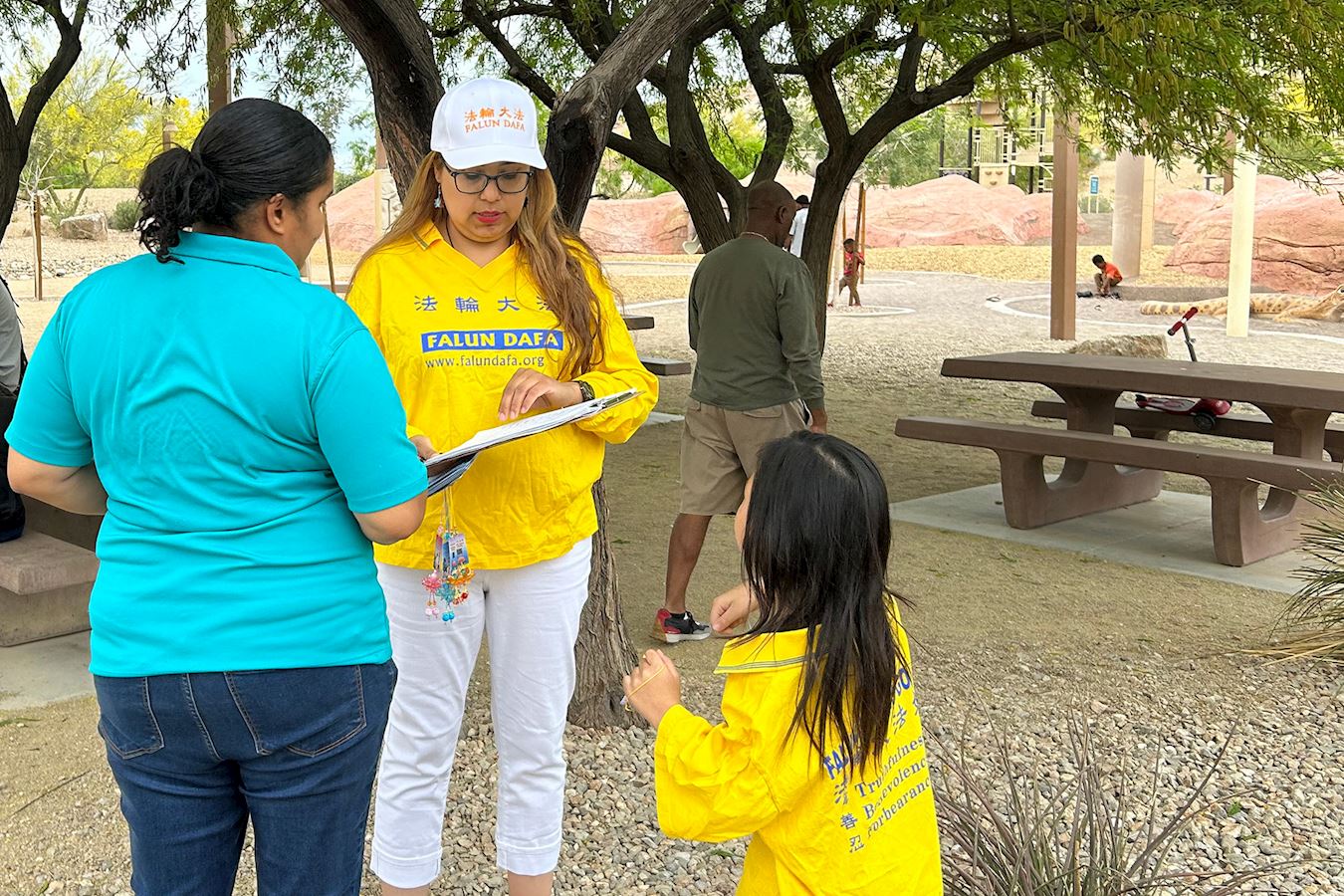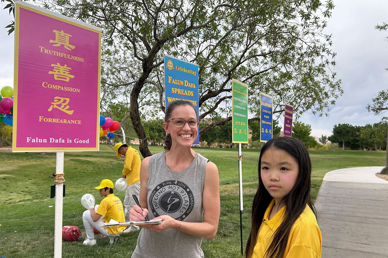 学员告诉她:“法轮功是一种佛家修炼方法,遵循真、善、忍做好人。在中国仅仅因为信仰就遭受迫害,很多修炼者在监狱遭受酷刑。我们正在征集在《法轮功保护法案》的签名。”她听后爽快地签下了自己的名字。