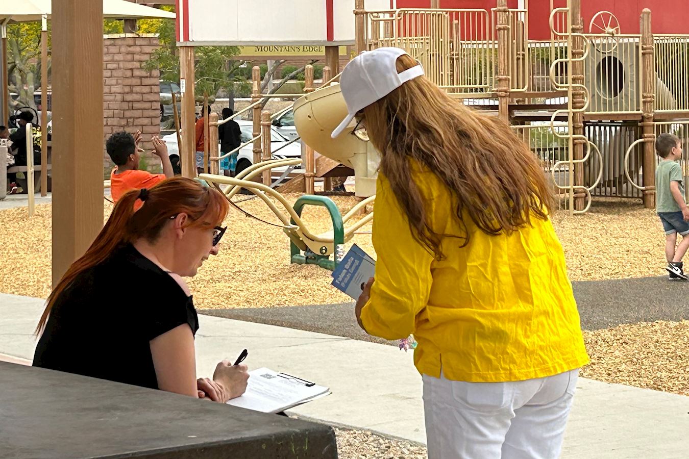 ![]() 图12:墨西哥裔青年学员杰基(Jackie)(着黄色上衣者)向游人发放大法资料,征集《法轮功保护法案》签名。 |