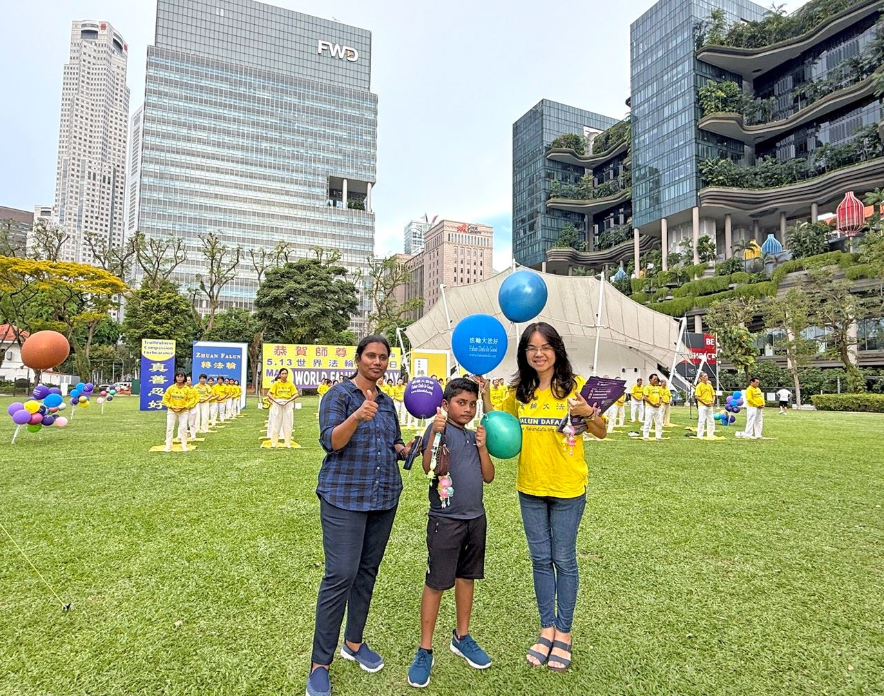 来自印度的尼兰(Nilan)携十岁儿子来新加坡探亲。三天前在学员介绍功法后,她尝试抱轮,感到格外舒服。当天,她带着儿子特意赶到庆典现场,期盼参加接下来的法轮功九天免费学习班。尼兰的儿子十分喜爱五彩缤纷的小莲花,并合十恭祝:“师父生日快乐!”男孩还跟学员学着用中文讲:“法轮大法好,真善忍好。”