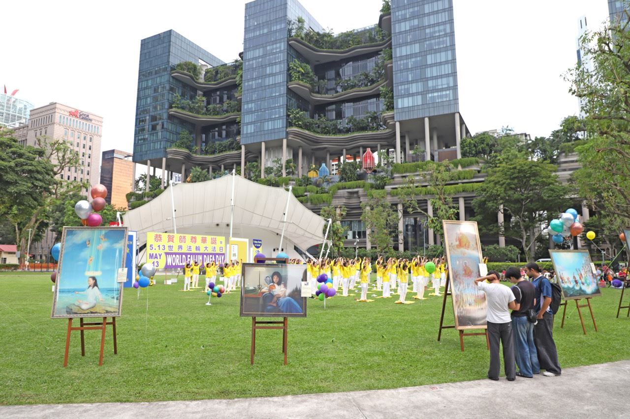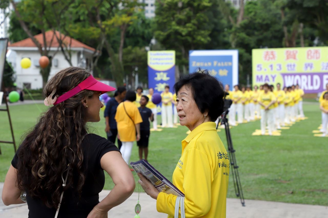 一位二十出头的新加坡男士伫立凝望活动场面,并与学员攀谈许久。他告诉学员自己是基督徒,对法轮功有所了解,对中共活摘法轮功学员器官的暴行也有所了解。他与学员深入探讨对修炼、宇宙和生命的认识,很认同人要保持信仰,保持道德。