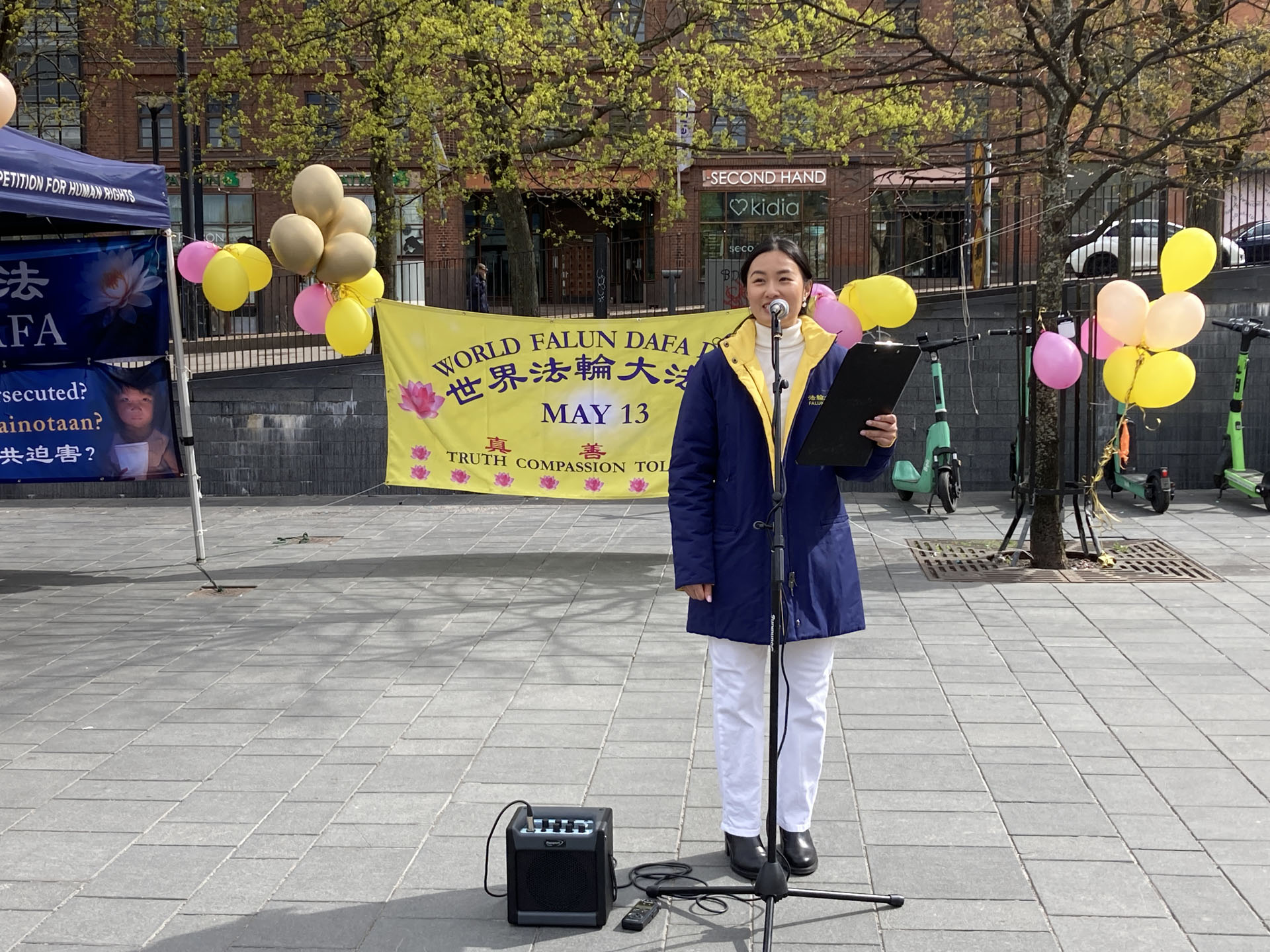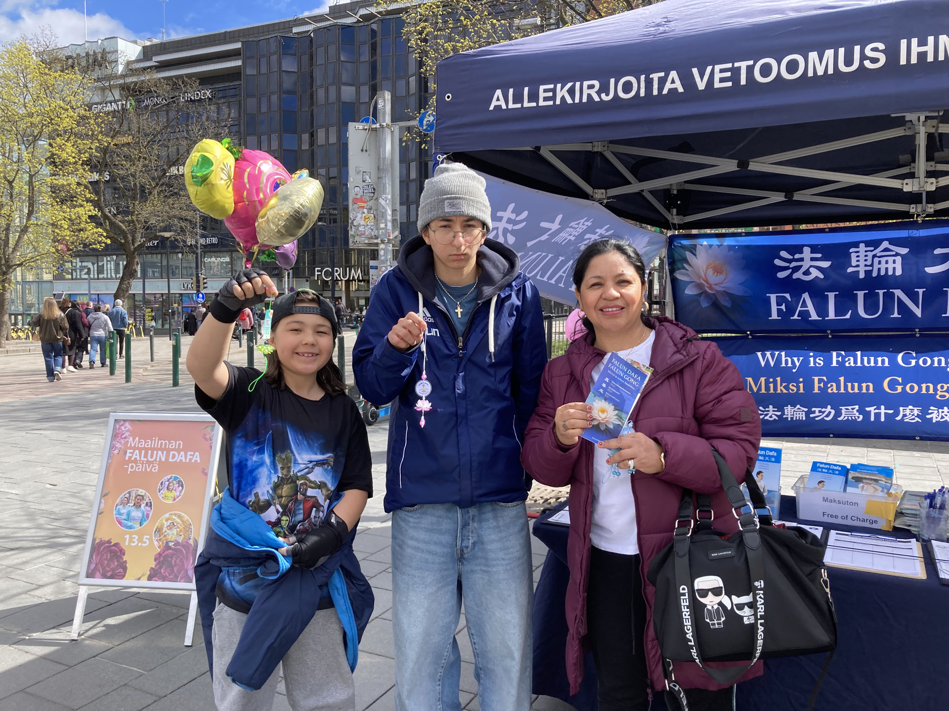 桑娜莉(Sannaly)是一位来自巴西的游客,近日与丈夫一同来到芬兰首都赫尔辛基旅游。当他们经过市中心的展位时,注意到正在进行的庆祝活动。桑纳利好奇的停下脚步,接过了法轮功学员递上的真相传单,而她的丈夫则认真聆听学员讲述中国发生的人权迫害情况。
