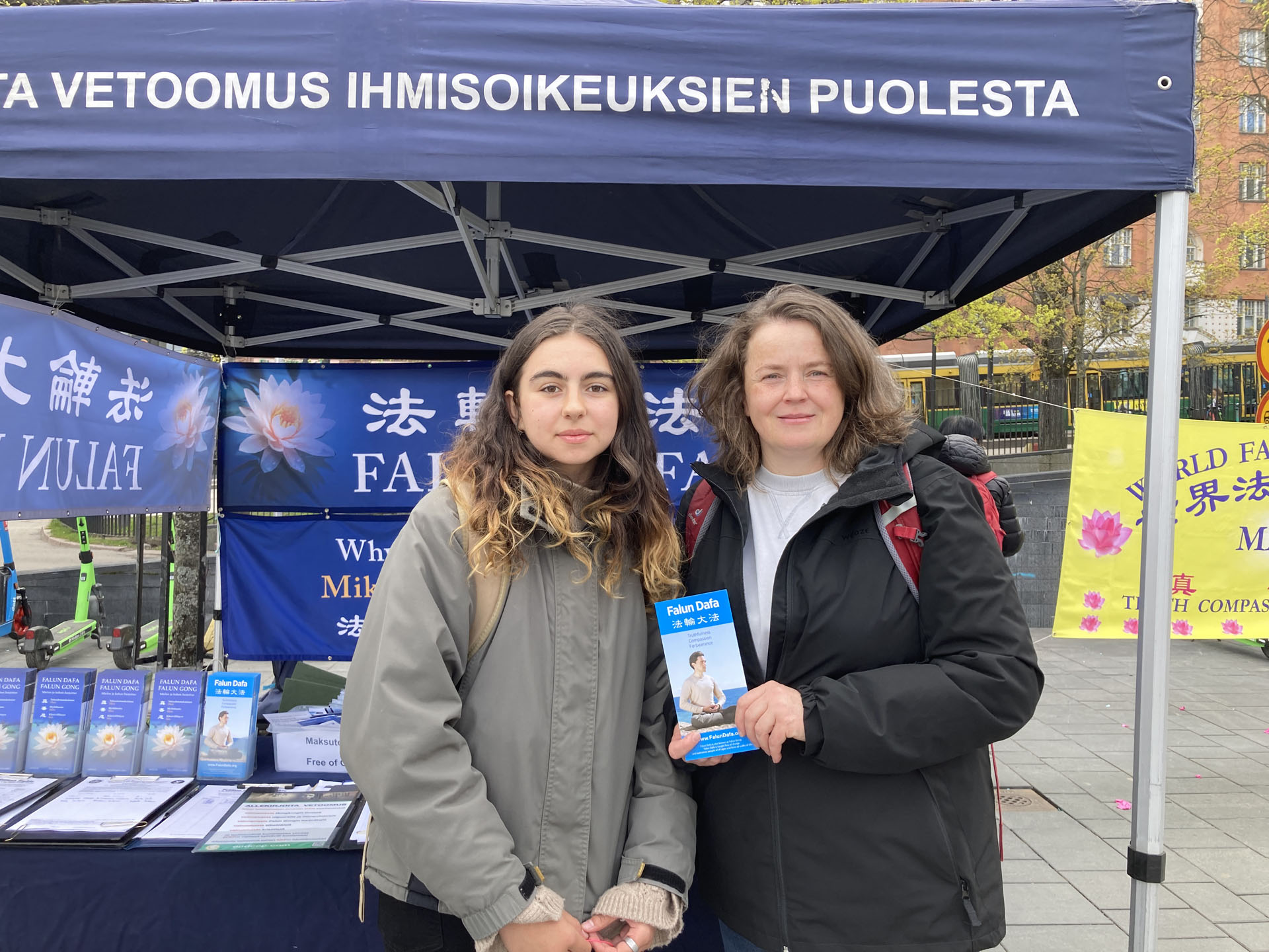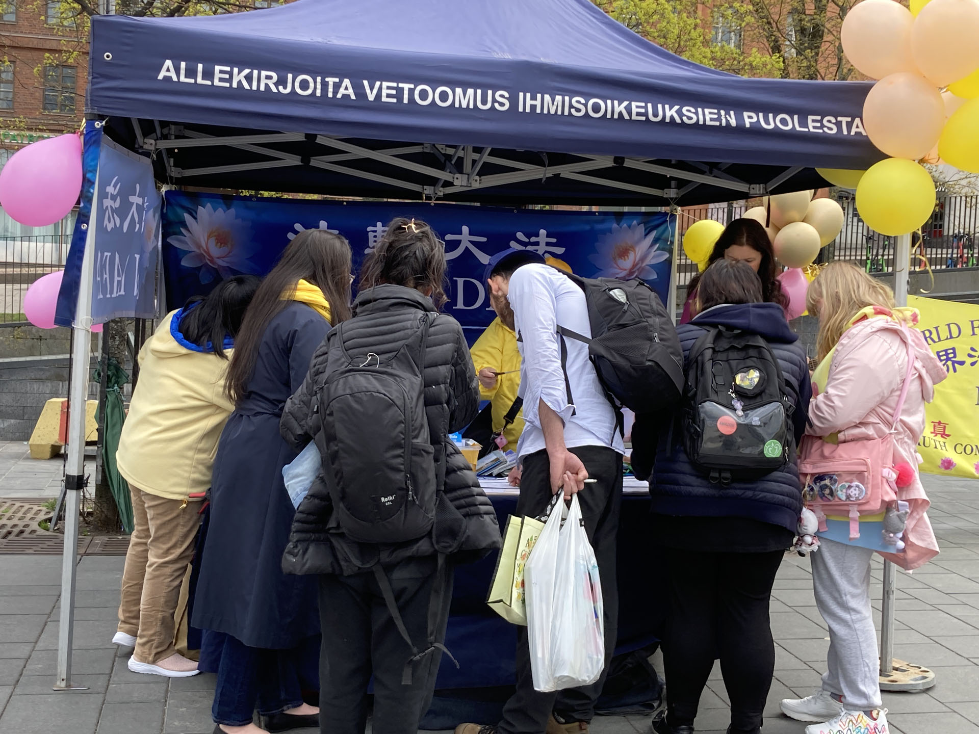 赫尔辛基大学的学生阿克塞利(Akseli)走到真相台前笑着跟学员攀谈起来,他表示:“法轮功是一种和平的修炼方式,是一种注重身心健康的修炼方法,我觉得他和中国的传统文化是相连的。”
