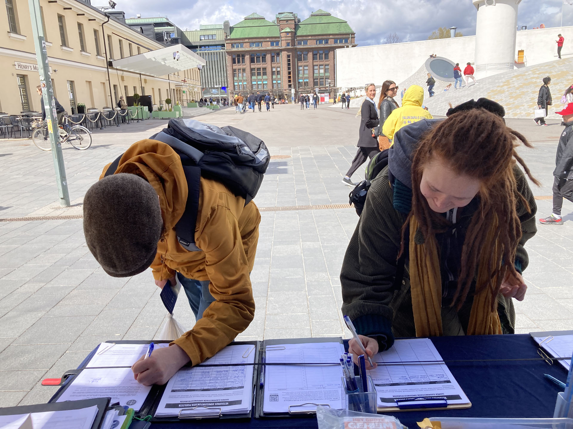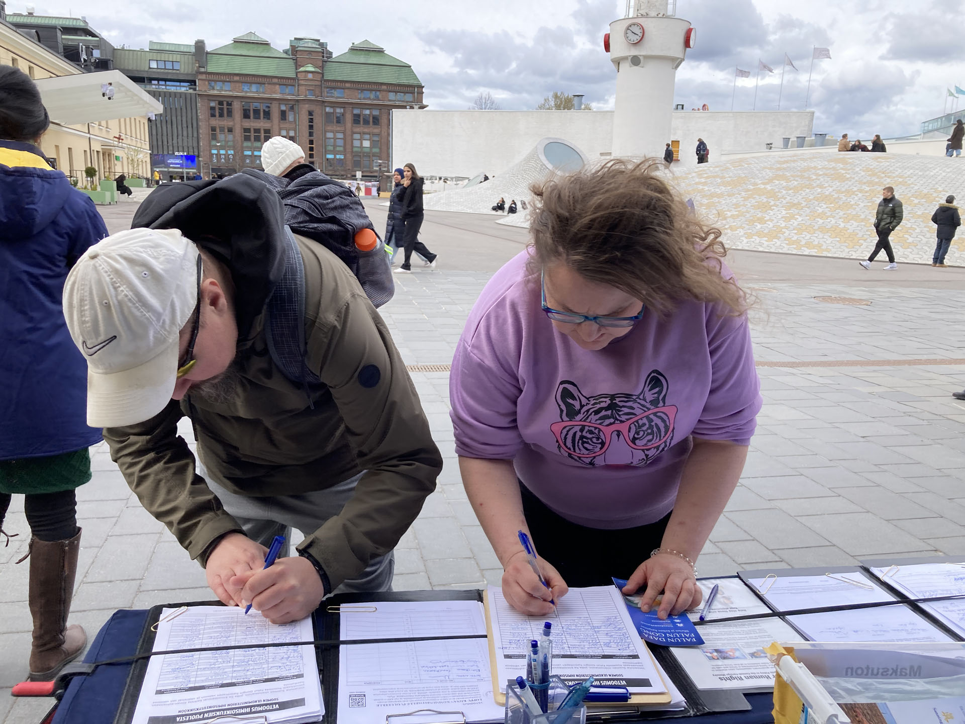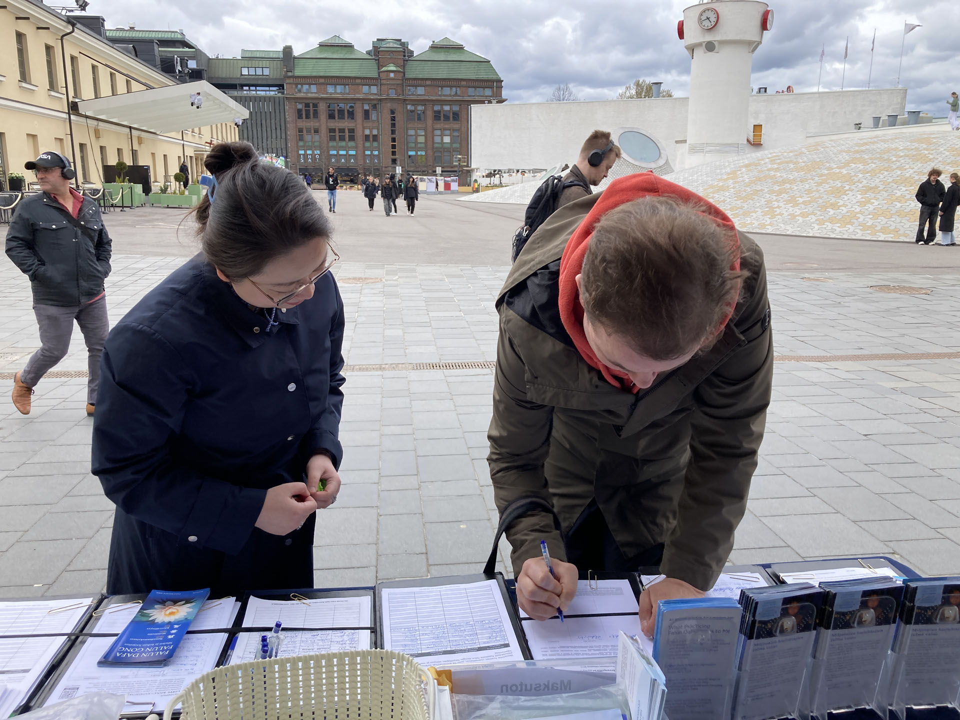 雷约(Reijo)是一位芬兰的退休老人,他独自一人来到市中心广场,远远被法轮功学员的活动吸引。他走进后,认真阅读展板上关于请愿活动的介绍。了解真相之后,雷约表情严肃地询问学员,你们有多少份请愿书?他希望每一份都能签上他的名字。他表示,作为一个有良知的公民应尽的责任是用行动支持正义。