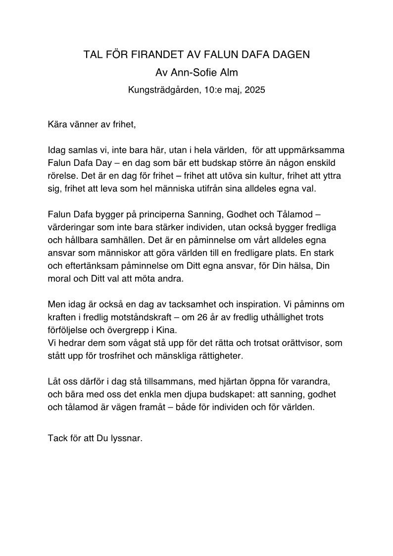 彼得·伍乐恩 (Peter Ollén)对法轮大法日庆典活动发来的问候:“春天的到来对于我们北欧人来说有着非常特殊的意义,光明驱散黑暗,大地百花盛开。我很高兴你们也在庆祝春天的到来,并祝愿你们在瑞典的自由中度过明亮而美好的一天。” (Vårens ankomst betyder något alldeles speciellt för oss här i Norden, där ljuset trycker undan det mörka och marken blommar. Det gläder mig att även ni firar vårens ankomst och jag önskar er en fin och ljus dag i svensk frihet.)