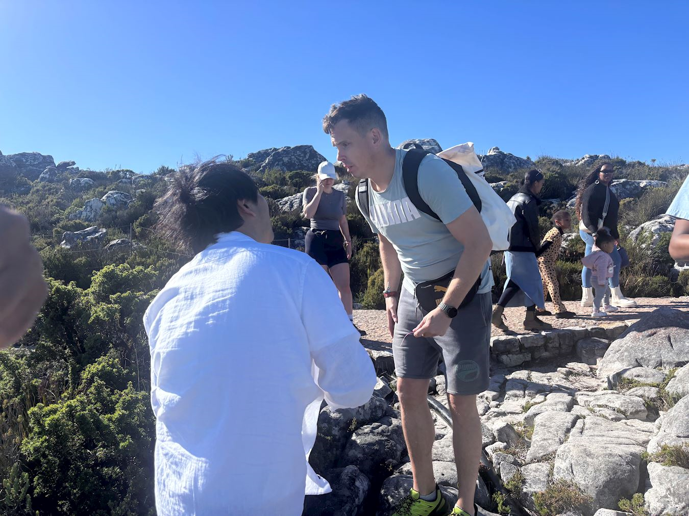 学员们先来到了好望角的地标处,这里靠近大西洋一侧,打横幅,来来往往的游人,络绎不绝,这时一对北京的姐妹自行开车来取景,驻足和学员交谈起来。