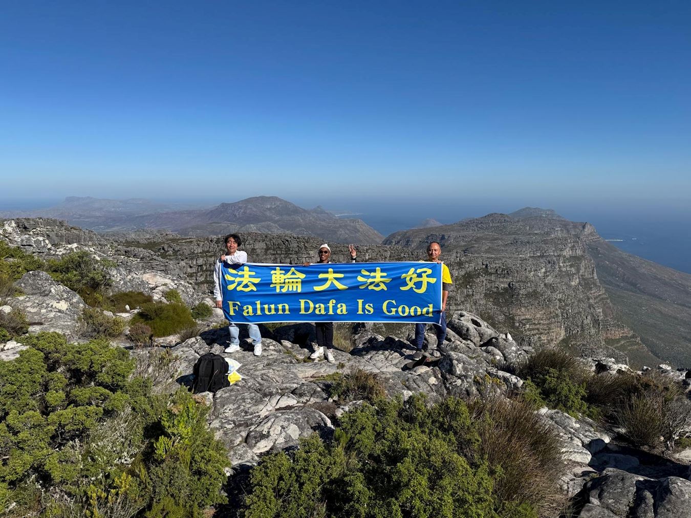 一对来自南非的兄弟看到学员们在桌山上打横幅很高兴,热情的打招呼。他们自己把横幅上的英文翻译过来,并向学员问好:“法轮大法好!”交谈中得知他们是东开普省的少数民族祖鲁族(ZULU)。了解真相后,热情的祖鲁族兄弟也和学员们一起举横幅,临别时要了当地学员的联络方式,还要告诉给他们的朋友。