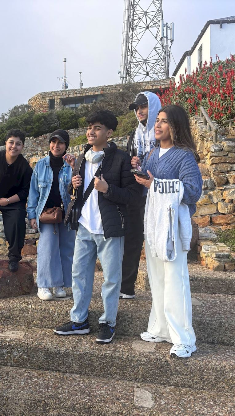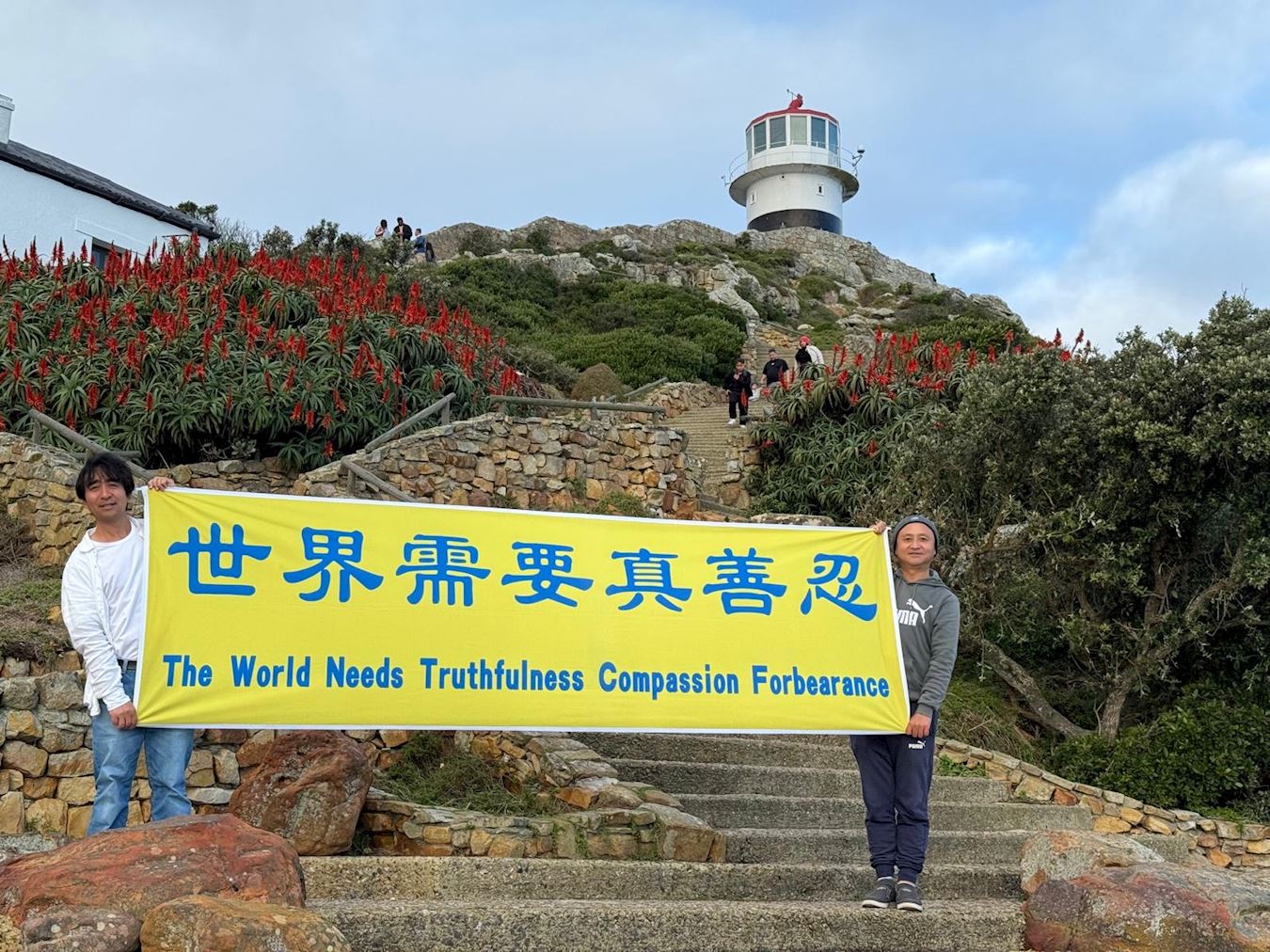 学员们最后来到了好望角的塔台,在这里碰上了一群沙特阿拉伯游客,他们非常喜欢学员们递上的真相小莲花。开始时,他们有些紧张,他们的父亲过来关心询问这是什么。学员们介绍了什么是法轮功,当得知法轮功是教人修炼真善忍的一种中国修炼的古老方法时,他的脸上露出了微笑,孩子们还和学员一起学说:“法轮大法好,真善忍好!”