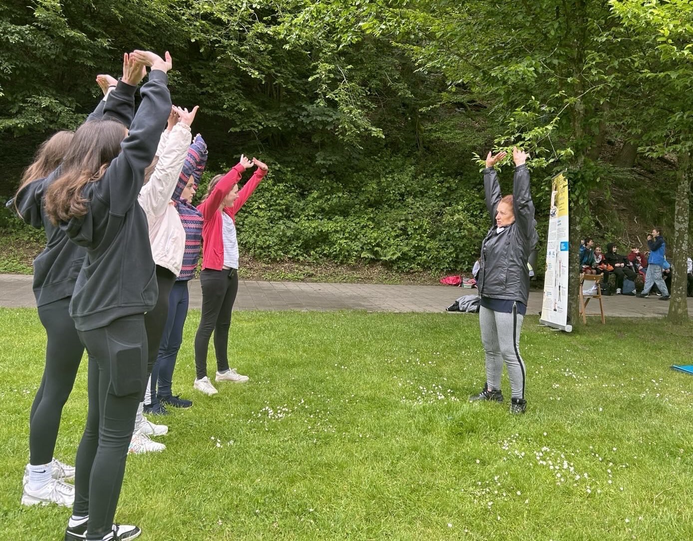 ![]() 图:米蕾娜(右一)经常在居住地附近的公园里炼功。图为她在教当地居民炼法轮功。 |